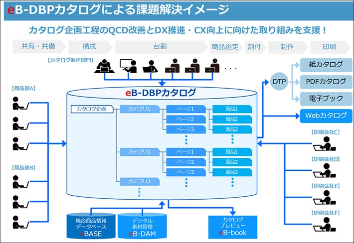 これらの課題解決を提供するソリューションが「eB-DBPカタログ」です。カタログ企画工程の品質・コスト・納期(QCD)改善と企業のデジタル変革(DX)推進、顧客満足度(CX)向上に向けた取り組みを支援します。