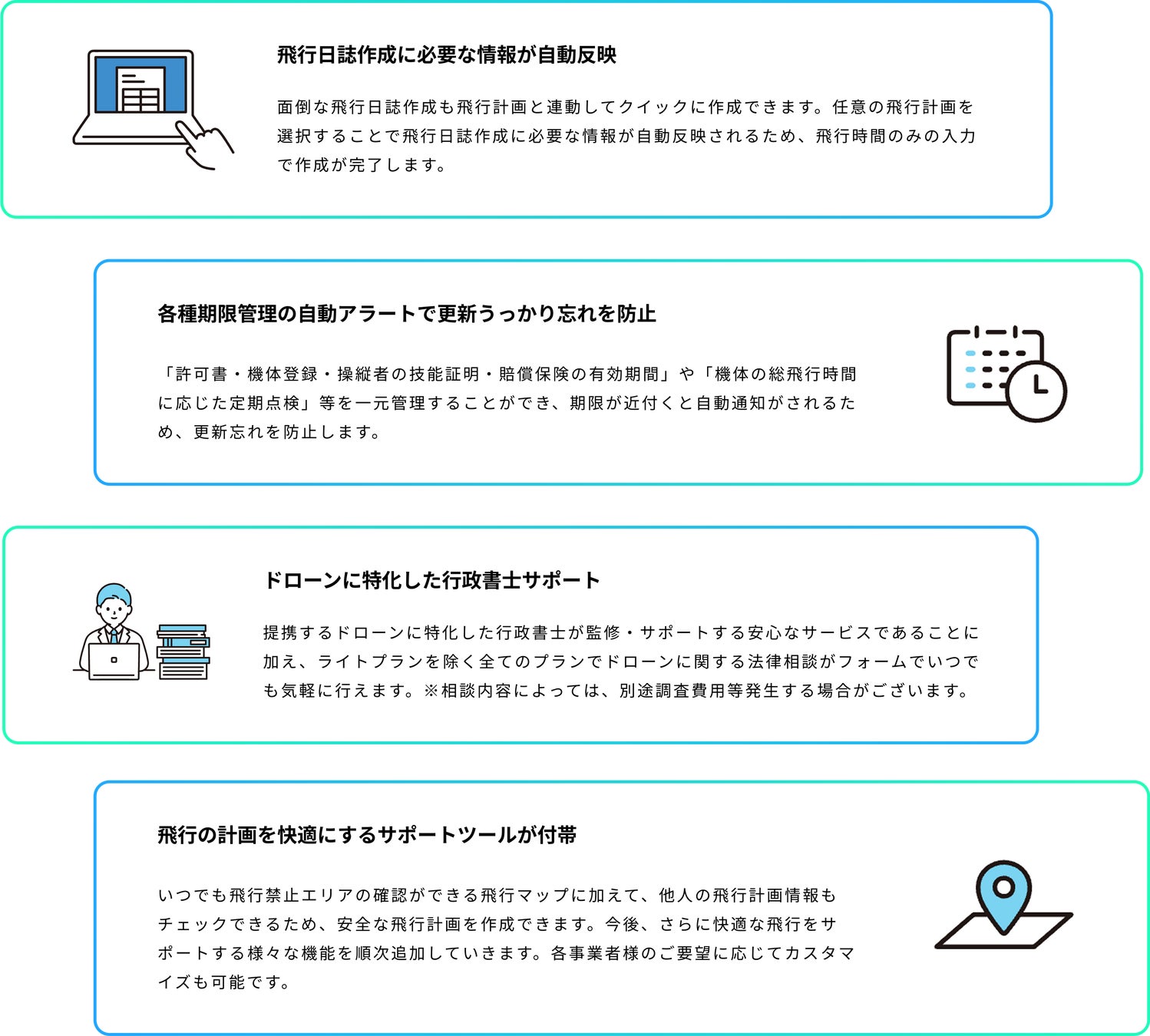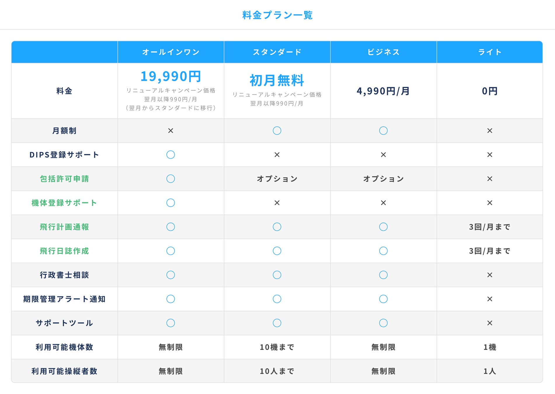 リニューアルキャンペーンとしまして、すべての機能がご利用いただけるスタンダードプランが1ヶ月間無料となるキャンペーンを行なっており、飛行日誌だけではなく様々なドローン運用に関する便利な機能がございますので、ぜひお試しいただけますと幸いです。