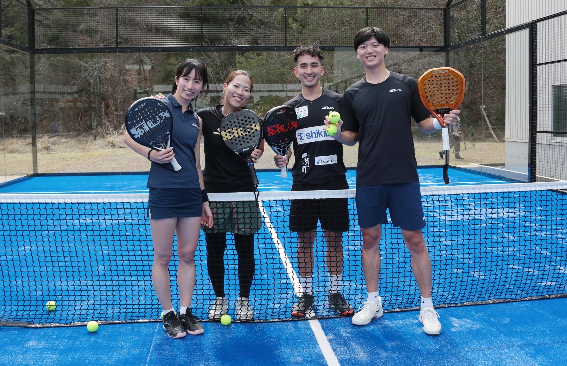 特徴としてテニスコートよりも小さなコートの四方を強化ガラスと金網で覆われた2人組対戦のみのラケットスポーツです。2013年に日本初のパデルコートが建設されて以来、パデルは日本国内で急速に成長を遂げています。2016年には日本パデル協会が設立され、その後、わずか2年で初のワールドカップに出場を果たすなど選手育成も着実に進んでいます。2022年にパデルスポーツ関連用品の輸入販売を行うProPadel Japan(株)が設立され、国内のパデル普及と発展に大きな影響を与えています。現在は、世界的にも競技人口が急増し、オリンピック正式種目としても期待されています。(写真:左より三砂 春奈選手、山田 梨央選手、平 レオン オリリアス選手、畠山 成冴選手)