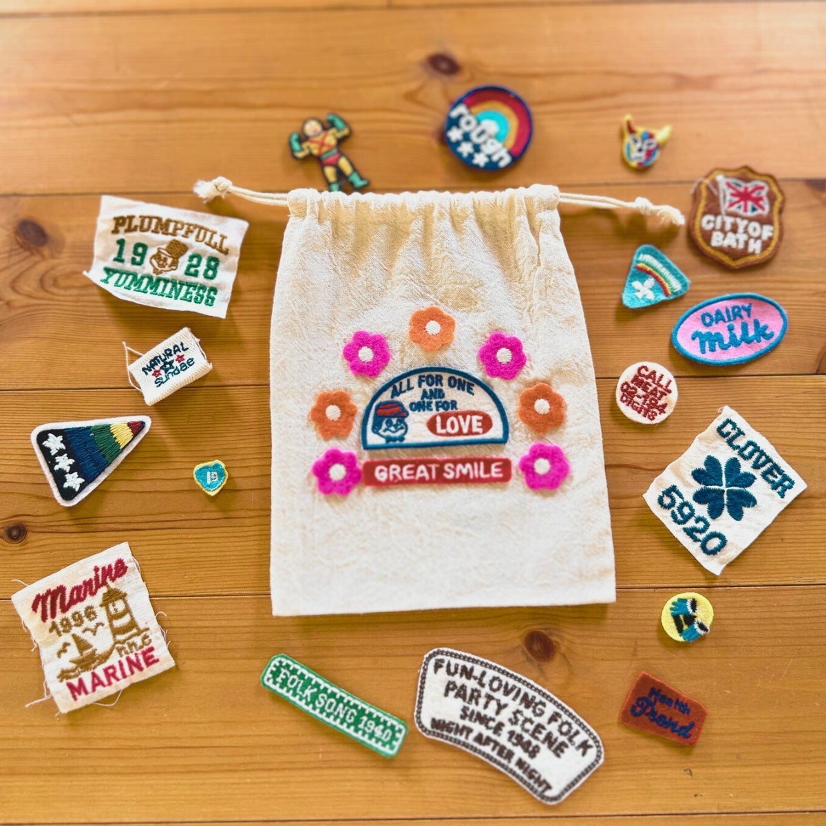 ・7月11・12日家族で楽しめるクラフト体験:『ワッペン張り放題♡オリジナル巾着を作ろう♪』(参加費:300円・税込)巾着は自由にワッペンを貼って楽しめる世界に一つだけのアイテム。お子様連れの方もぜひご参加ください。