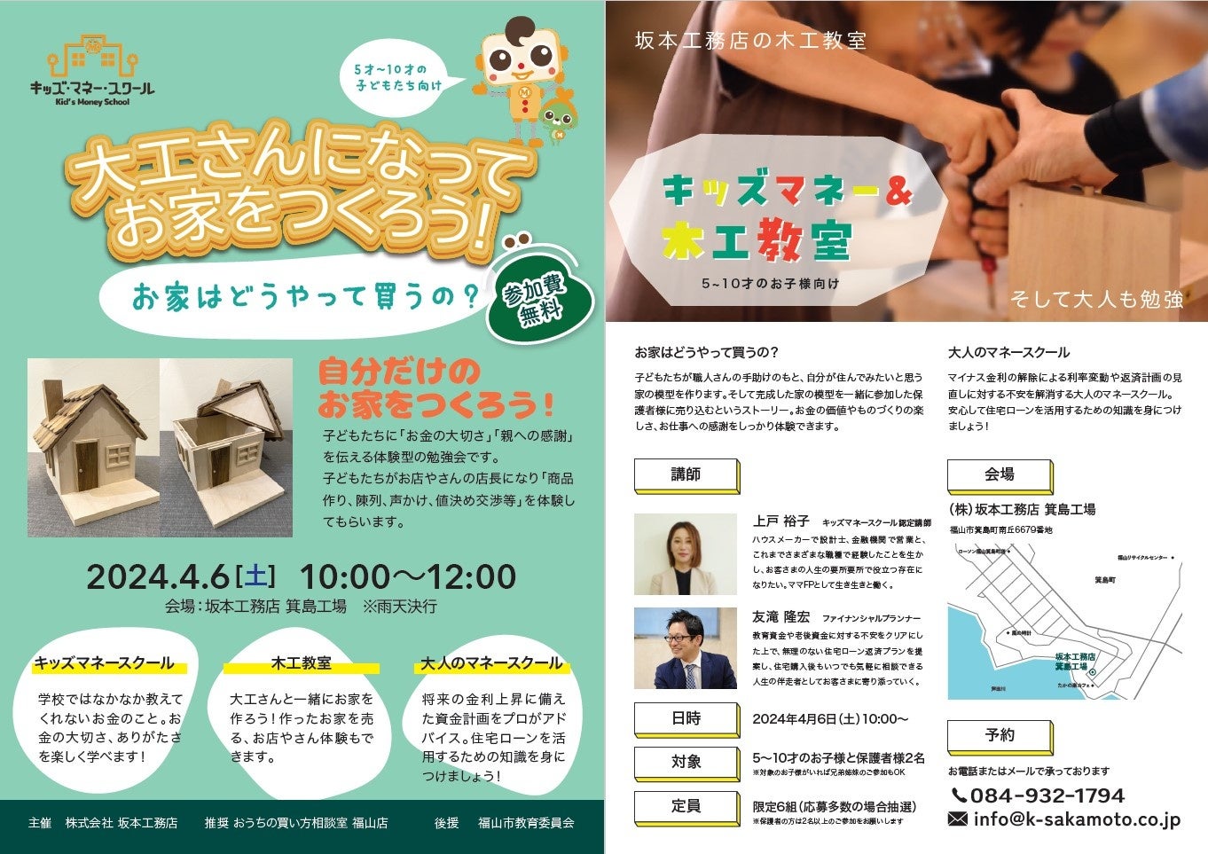 広島県福山市にて、住宅の新築およびリフォームを手掛ける株式会社坂本工務店(創業昭和9年 / 代表取締役:坂本 吉孝)は2024年4月6日(土)、お金について親子で学べる体験型イベント「キッズマネースクール」を、 福山市教育委員会後援のもと開催いたします。