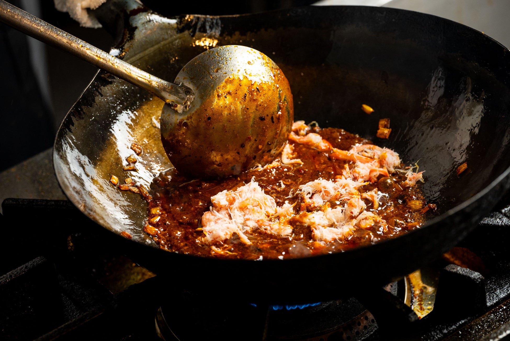 一丁の京豆腐とこだわりの麻婆を鉄鍋で加熱することで、豆腐全体に均等に火が通りムラなく調理が行われます。
