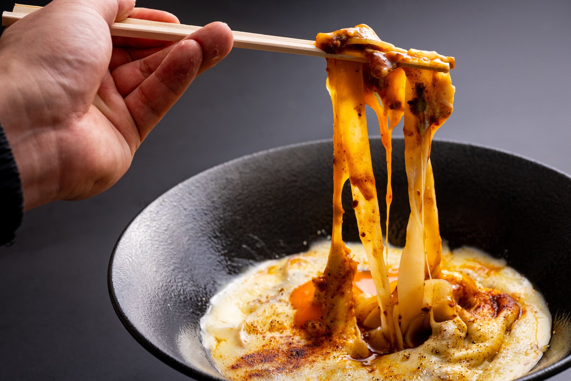 深みとコクのある餡にチーズが絡み、卵黄でさらに濃厚にした旨味たっぷりの「麻婆カレーチーズうどん」です。