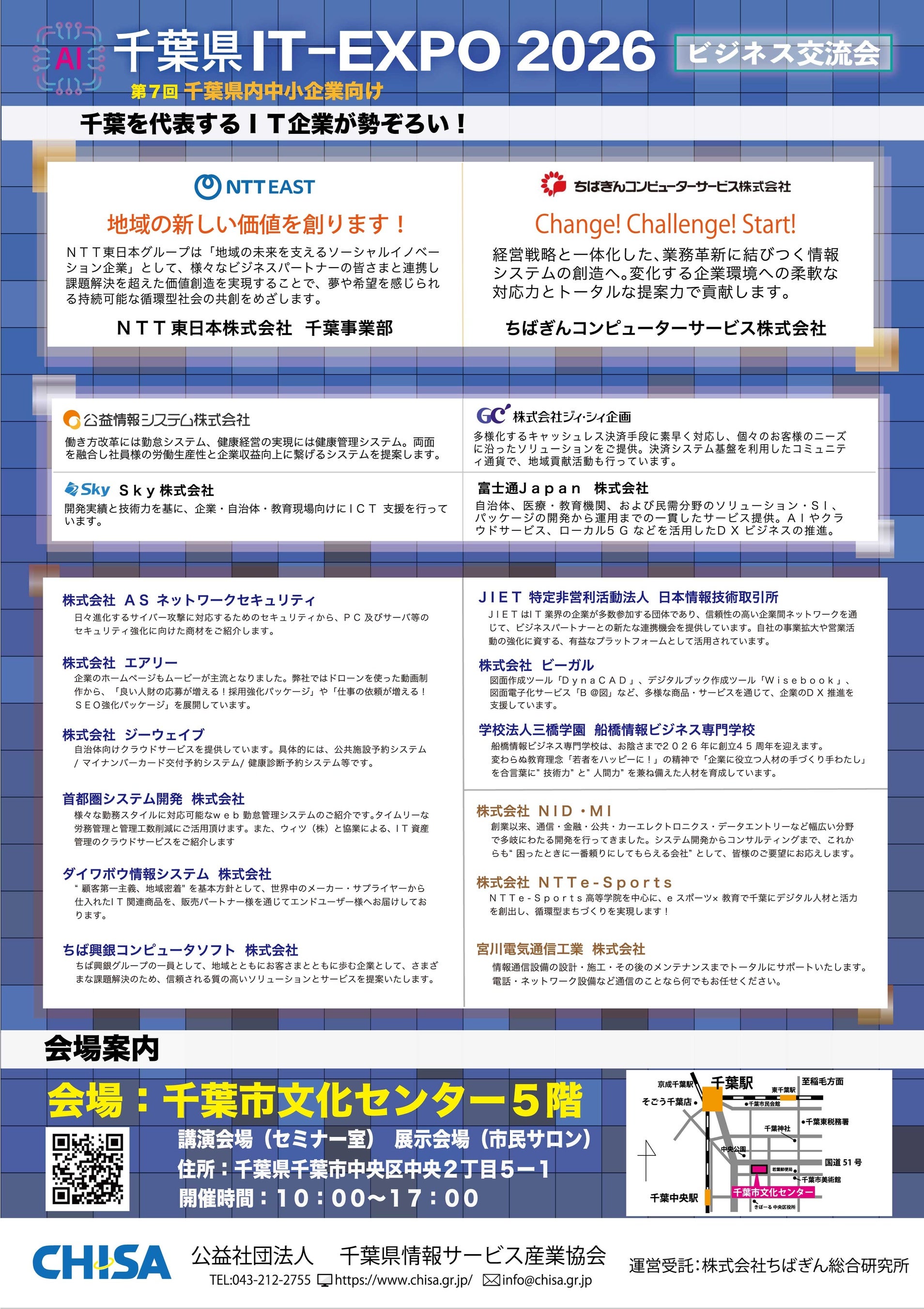 第7回千葉県内中小企業向けビジネス交流会開催 公益社団法人 千葉県情報サービス産業協会(CHISA)(千葉県千葉市美浜区、会長 宮城和彦)は、2026年2月6日(金)に「千葉県IT-EXPO2026 ー第7回千葉県内中小企業向けビジネス交流会ー」を千葉市文化センター5階にて開催します。