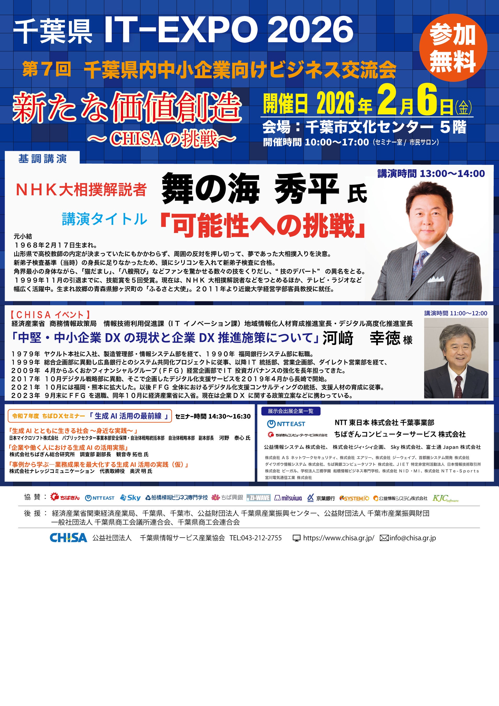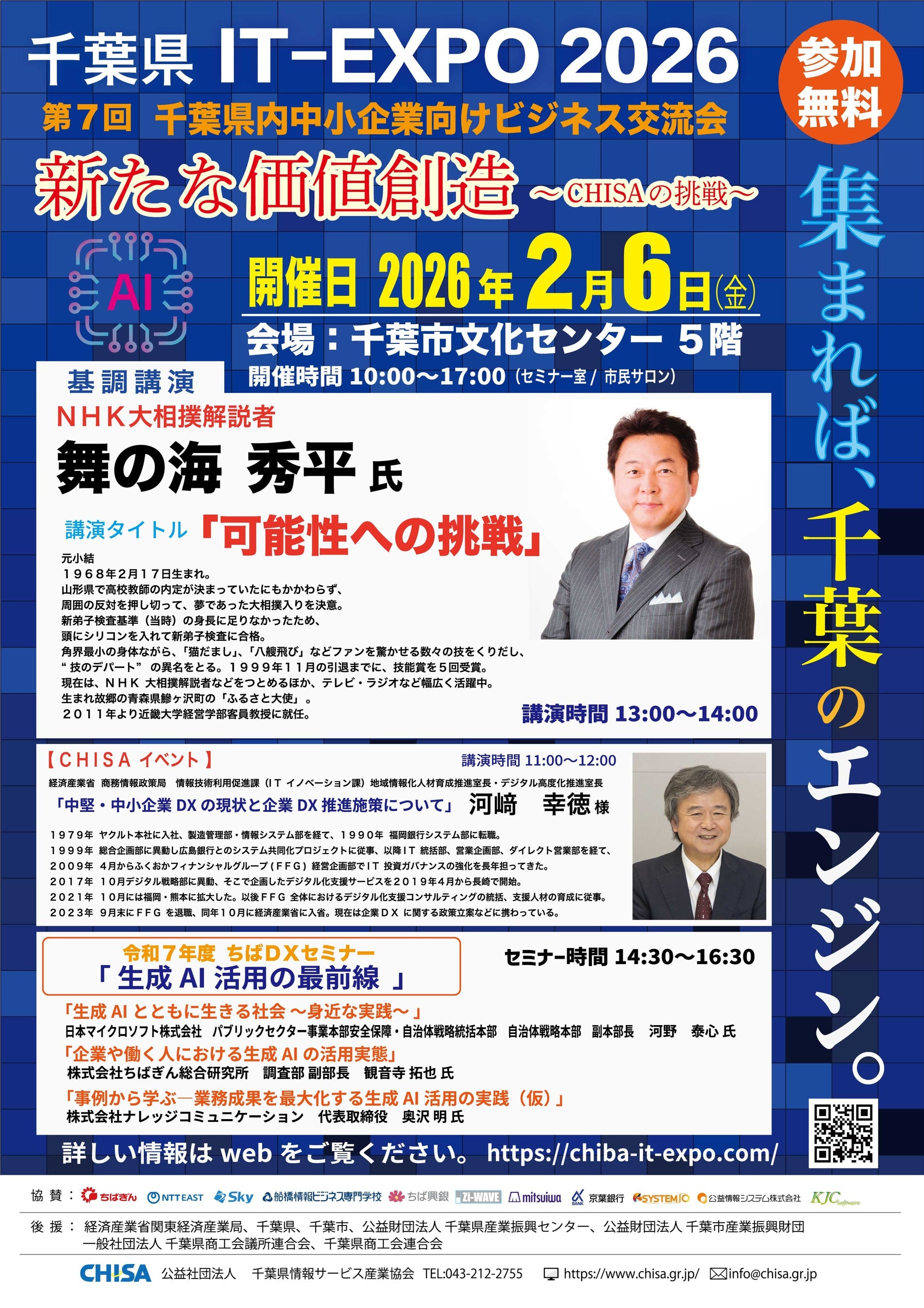 千葉県IT-EXPO2026「新たな価値創造 ~CHISAの挑戦~」第7回千葉県内中小企業向けビジネス交流会。基調講演に舞の海秀平氏、DX施策解説、県内IT企業18社が出展します。