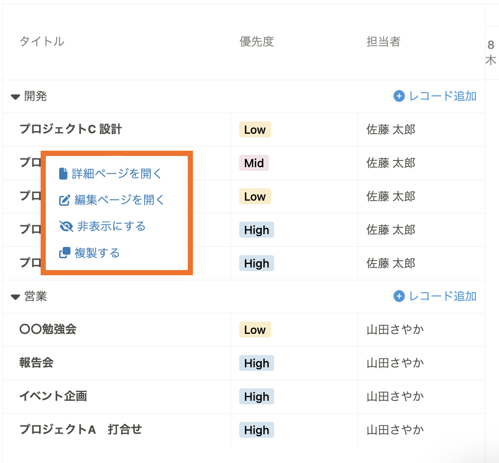 変更したいレコードのタイトルを右クリックすると、オプションメニューが表示されます。このアクションメニューを通じて、レコードの情報を編集したり、非表示・複製することができます。