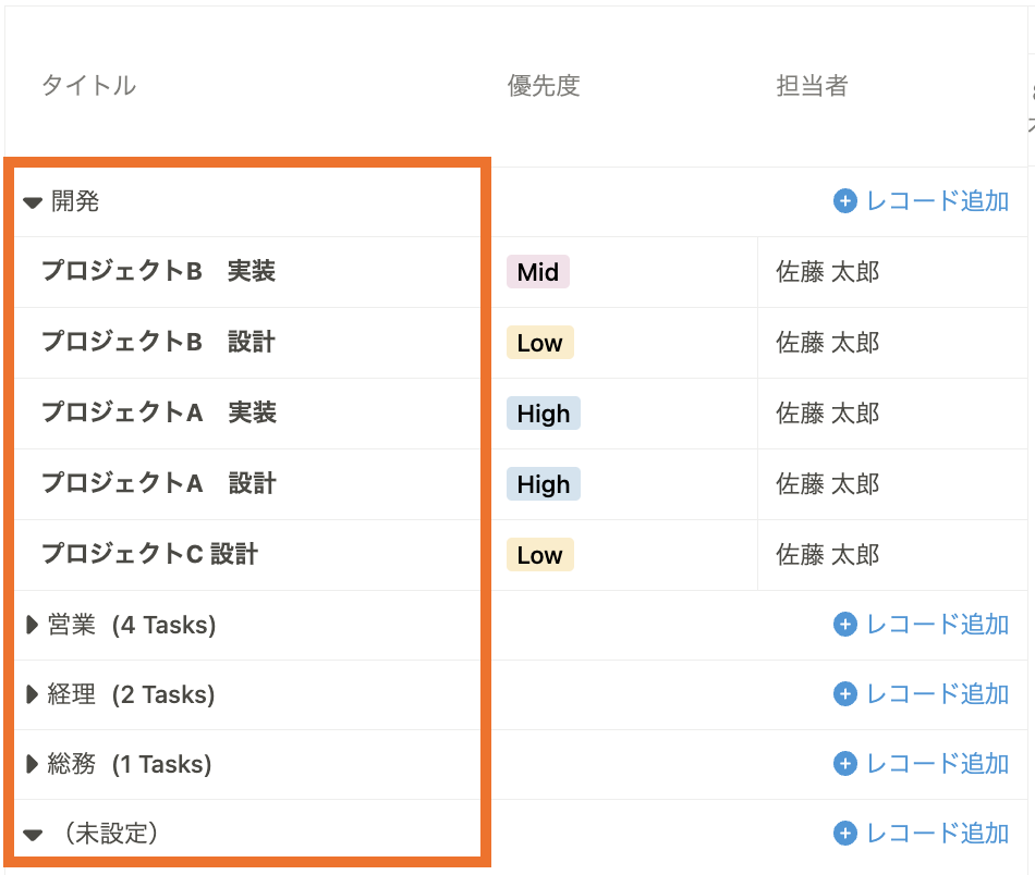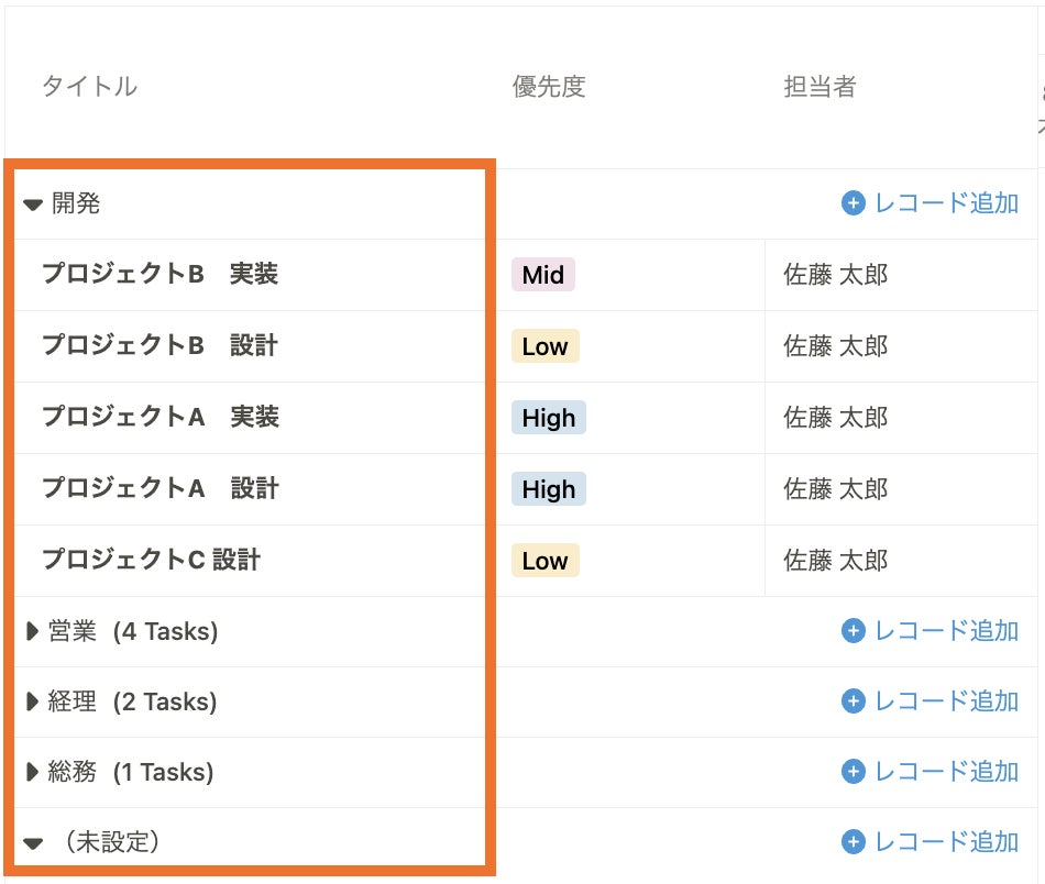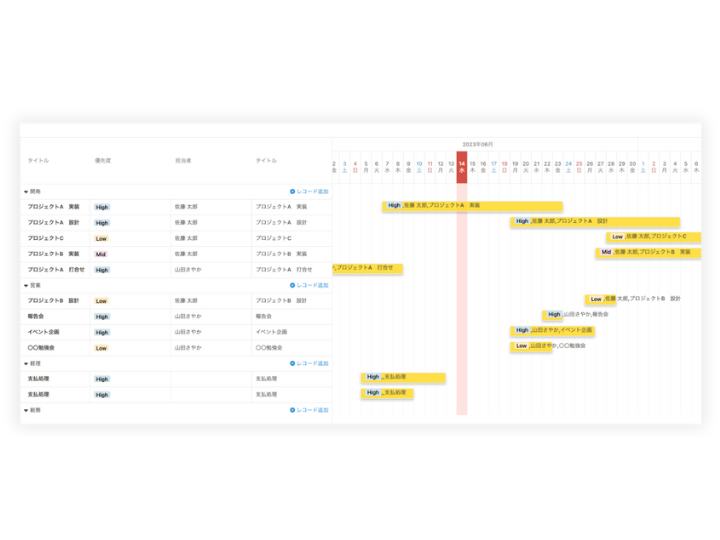 関連するタスクやプロジェクトを特定のカテゴリやチームにまとめて表示することができます。これにより、プロジェクトの異なる側面や関連性を一目で把握することができます。特定のグループに集中することで、各グループの進捗状況や負荷バランスを把握しやすくなります。