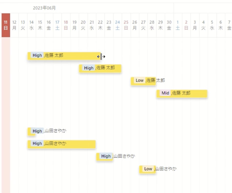 マウスによる操作だけで、スケジュールの移動や期間の変更を行うことができます。これにより、プロジェクト全体を一望しながらタスクを簡単に調整することが可能となり、スケジュールの調整が容易になります。