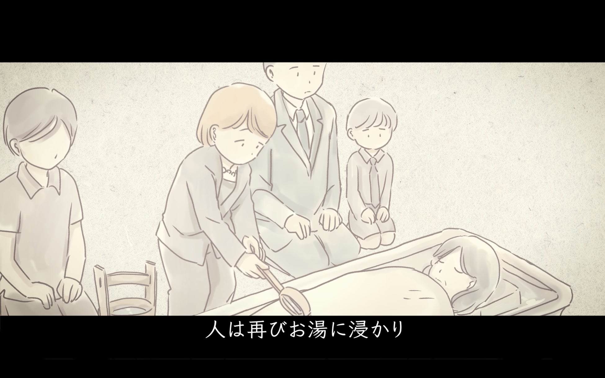 本動画『産湯の恩返し』は、湯灌という儀式の尊さを、 やさしい語りとアニメーションで描いた約2分30秒のショート作品です。