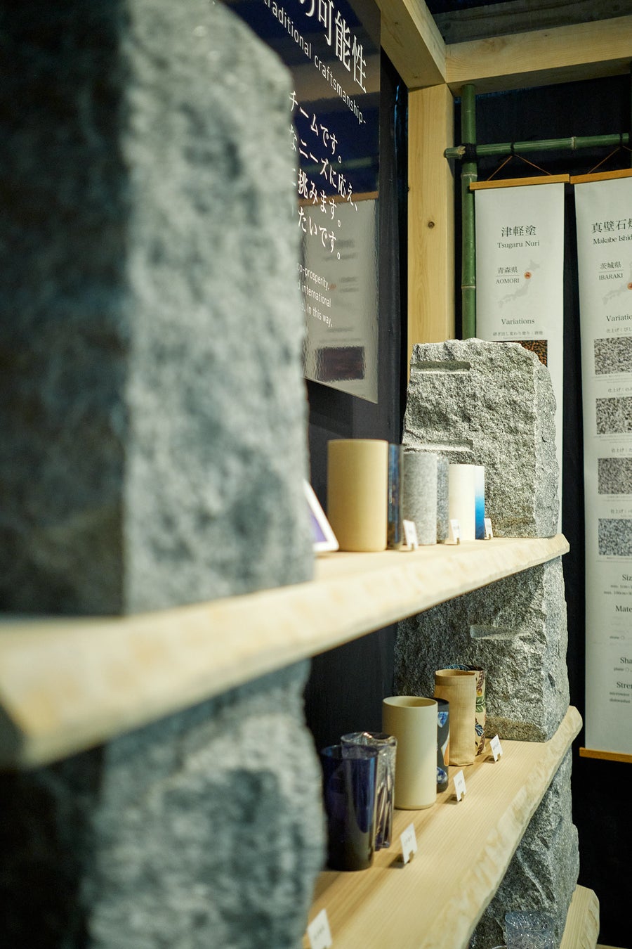 本出展は、ブランドジャパン(東京都豊島区/代表:伊窪拓真)の理念に賛同し、出展ブースの設計施工に全面協力したものです。日本の伝統文化を伝える場として、日本の様々な素材を用いて本物にこだわってデザインをいたしました。八ヶ岳南麓の当社本社の敷地内に自生する竹、当社大工が手仕事で刻んだ山梨県産の檜や杉の他、神社仏閣など歴史的構造物に使われる佐久石、結晶の変化が美しく迎賓館赤坂離宮にも使われている真壁石など、素材を厳選したものです。ファサードの坪庭には富士山の溶岩石をアクセントに、展示会場の雑沓の中でも安らぎを感じられる唯一無二の空間を演出しました。