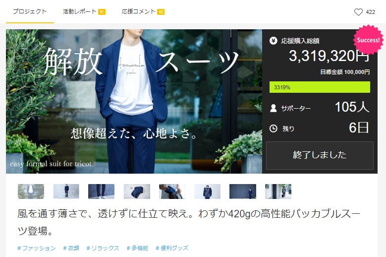 トリコットテキスタイルメーカー・川田ニッティンググループ(本社:富山県南砺市、代表:川田征利)は、ファクトリーブランド「tococie(トコシエ)」より、暑さ、重さ、窮屈さなど多くのストレスからの解放を目指した「解放スーツ」の商品開発を行い、完全限定生産105セットにて応援購入サイト「Makuake」でのプロジェクトを開始しました。プロジェクト開始25分で目標金額である10万円を達成。60日で105セットを完売いたしました。
