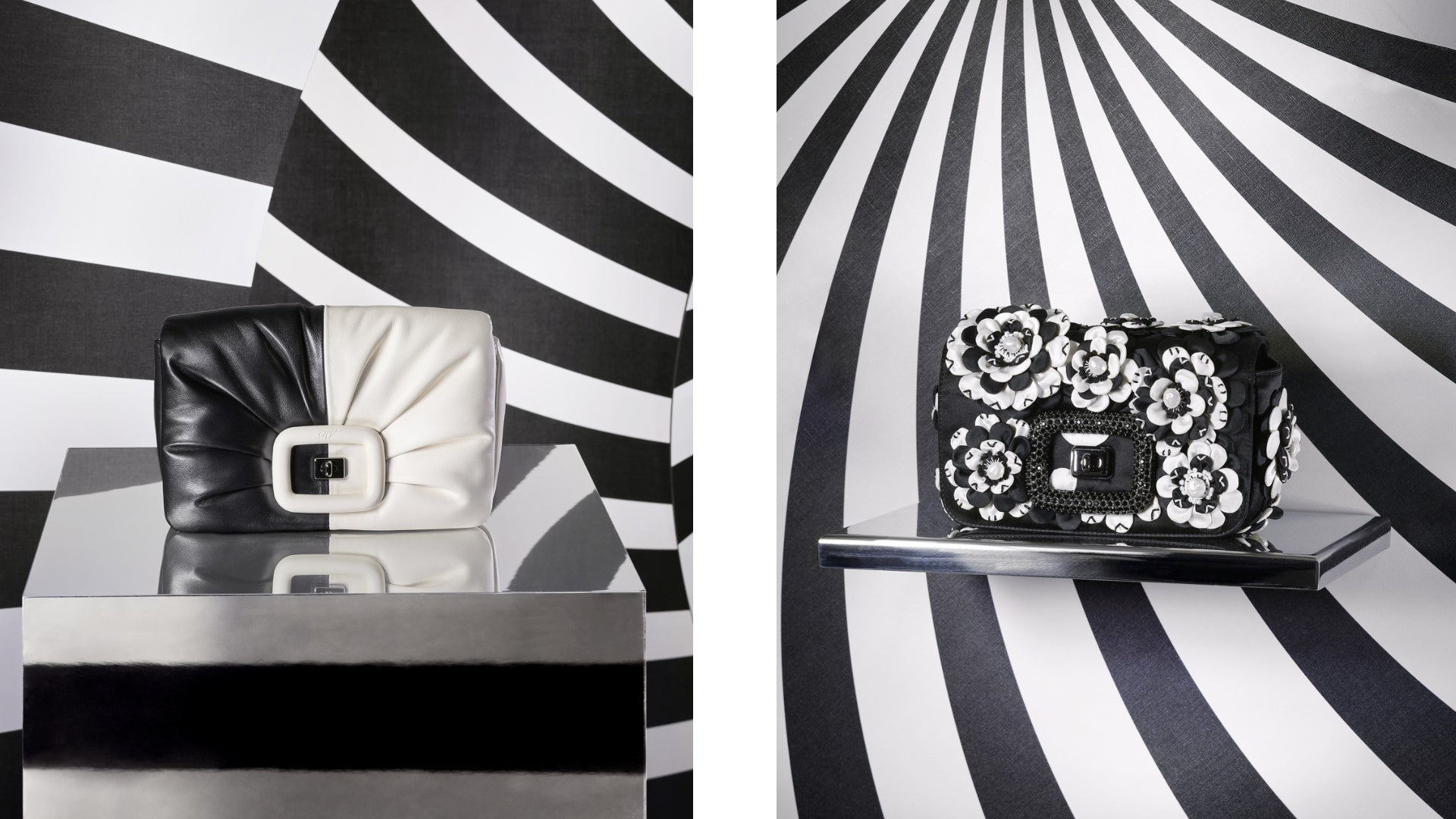 18世紀に建てられた邸宅の壮大な中庭から一歩足を踏み入れると、そこに広がるのは市松模様の大理石のオプティカルイリュージョン。まばゆいばかりの遠近感と螺旋状の渦の中でムッシュ・ヴィヴィエの色鮮やかなアート作品がもつシアトリカルな豪華絢爛さが命を宿します。VIVIER OP-TICALプレゼンテーション、一つ目のサロン「ブラック&ホワイト」(Black and White)ではバッグ、ハット、ジレ、ジュエリーといったロジェ ヴィヴィエのアクセサリーメゾンへの進化を象徴する空間です。ゲラルド・フェローニがデザインしたメゾンの新アイコン、Viv Chocバックは、ブラック&ホワイトのモノクロバージョンで再登場。ブロックカラーのスムースレザーとチェックツイードのデザイン、そしてパッチワークにフリンジ、どれも煌びやかに輝くオプティカルストライプをあしらうことで、エレガントなデザインがモダンかつ華麗に変身しています。またViv Canardもモノクロバージョンで登場。今回初めて、メゾンのクラシックなバックルがあしらわれています。