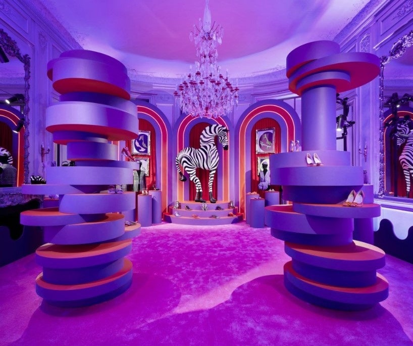 二階のオプティカル・ゼブラ(Optical Zebra)サロンは、ムッシュ・ヴィヴィエの動物界への愛にオマージュを捧げたスペース。特に、ヴィヴィエのペーパーコラージュや1960年代のアーカイブのデザインに多く登場するゼブラパターンがフィーチャーされています。スカーレットとロイヤルパープルの華やかな装いをまとい、幾重にも重なったアーチや敢えてアンバランスに積み重ねられた円柱の柱が並ぶカラフルな空間。その中心的存在となる巨大なゼブラのオブジェが、今シーズンのクリエイションの数々と、JOIE DE VIVRE(生きる喜び)をもって共鳴します。I Love Vivierパンプスや、Viv Chocのバックルからインスパイアされたメタルプラットフォーム付きのハイヒールブーティから、フリンジ付きのマキシサイズのViv Chocバッグまで、コレクションにはソフトスエードやカーフヘアをふんだんに採用。また、今回もジレがロジェ ヴィヴィエのコレクションの中心的アイテムとして登場し、華やかなメタルスタッズからフリンジアクセントまで、多様なスタイルで解釈されたクリエイションの数々が、2024/2025年秋冬コレクションを彩ります。