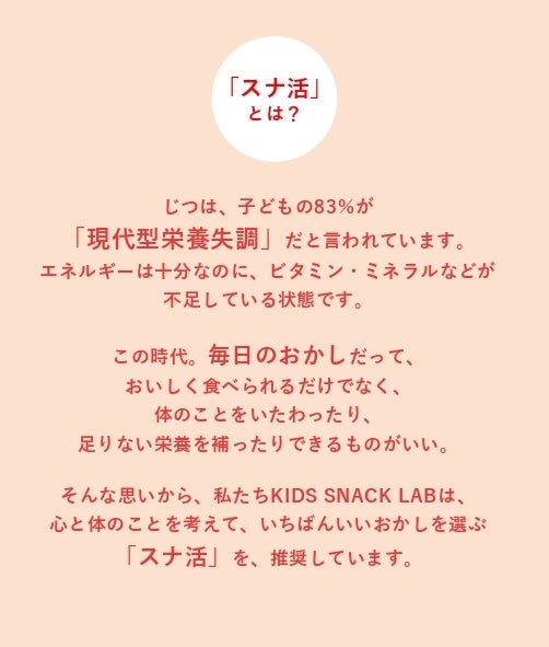 KIDS SNACK LABは、このような時代だからこそ、おいしく食べられるだけでなく、体のことを労ったり、 足りない栄養を補えるお菓子を選ぶ、新しいお菓子との付き合い方「スナ活」を推奨しています。