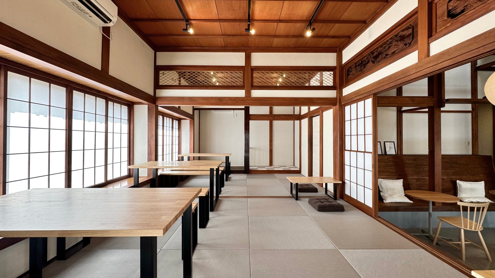 2階床を一部減築することで、歴史ある木造の温かみを残した明るく開放的な空間を実現しました。靴を脱がずに入店できる土間、畳に座れる床座エリアに加え、キッズスペースも完備し、お一人様からファミリーまで様々な方がゆったりと過ごせる空間を目指しました。