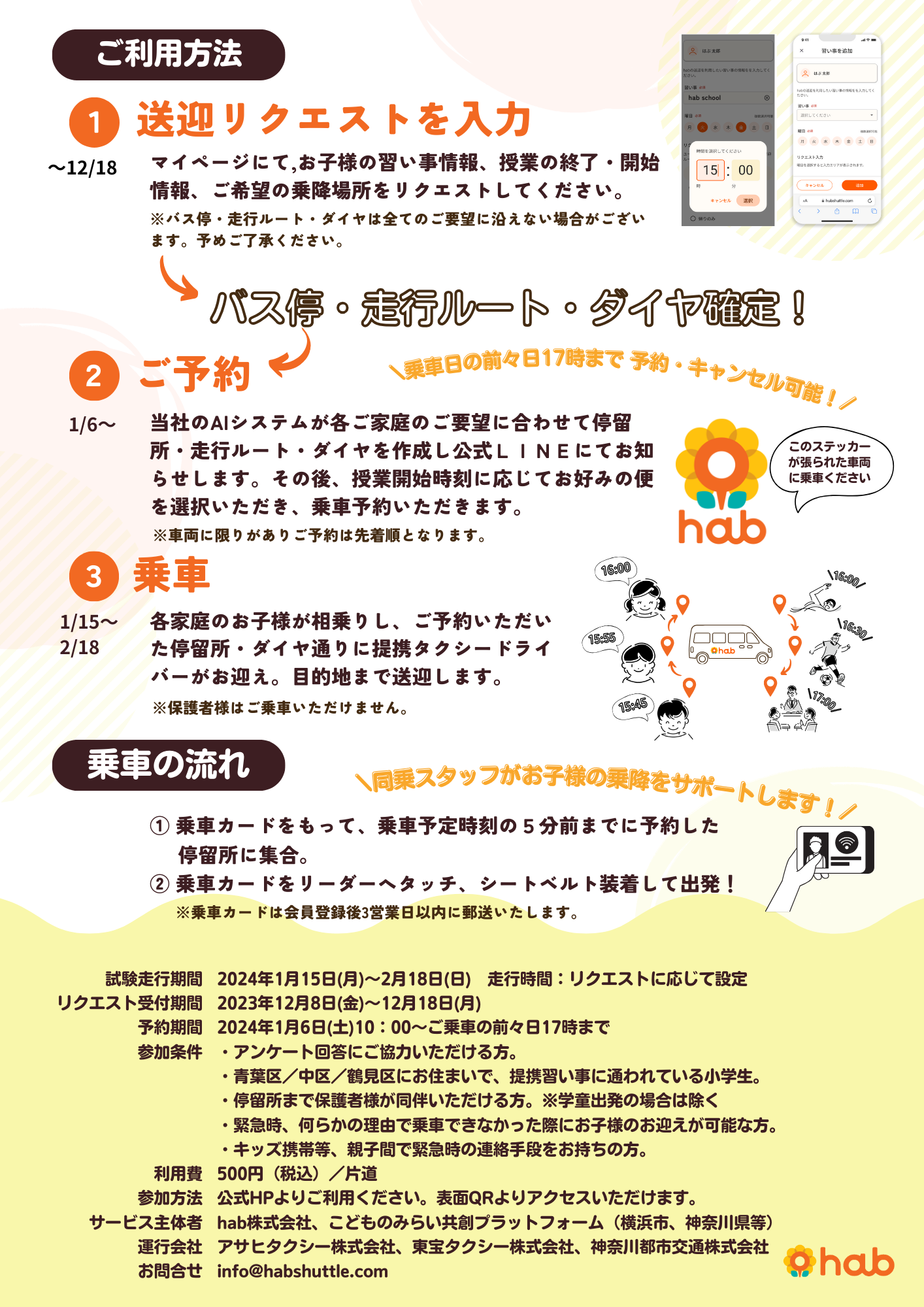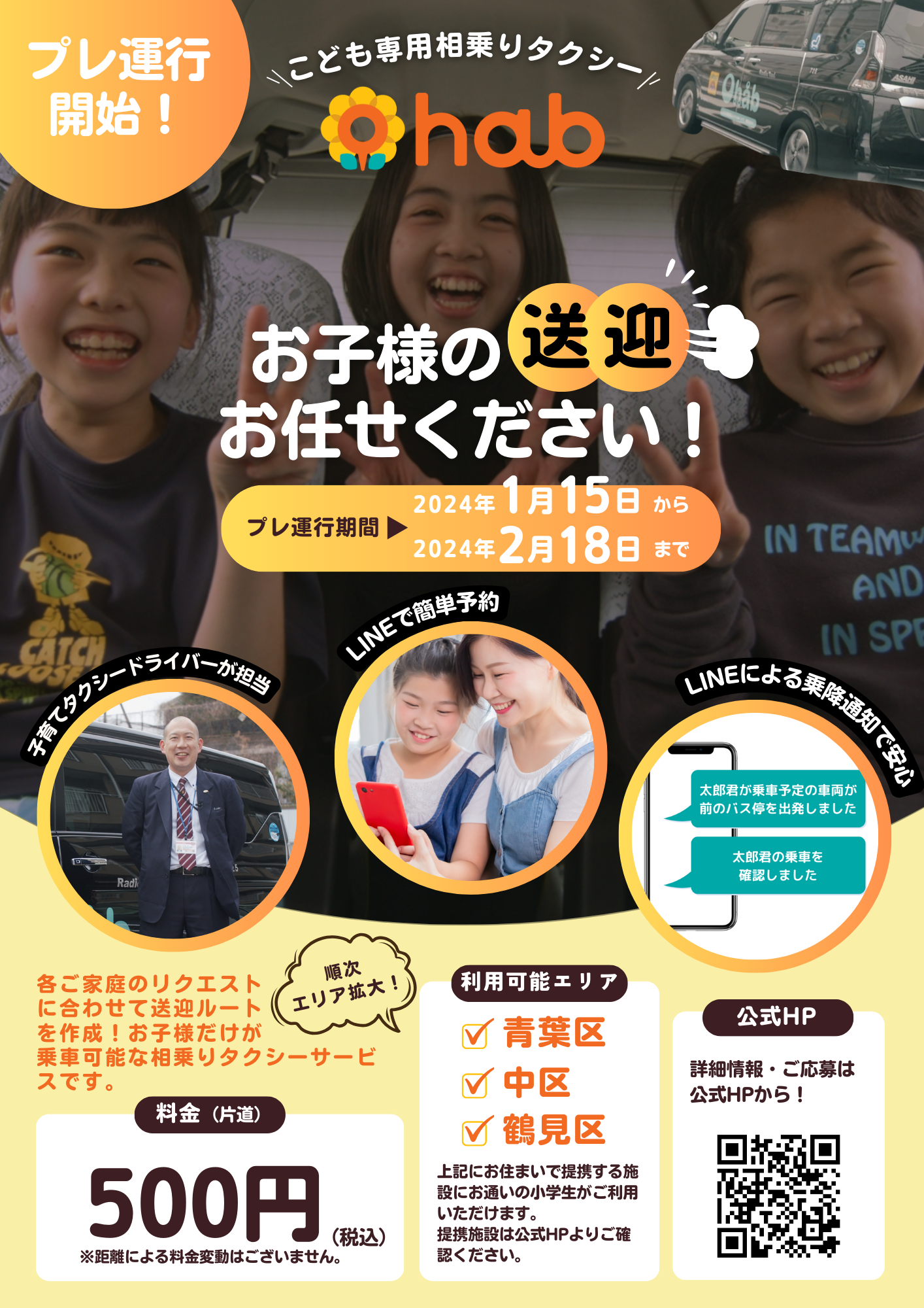 こども専用相乗りタクシー送迎サービス「hab」、試験走行の利用登録を開始!