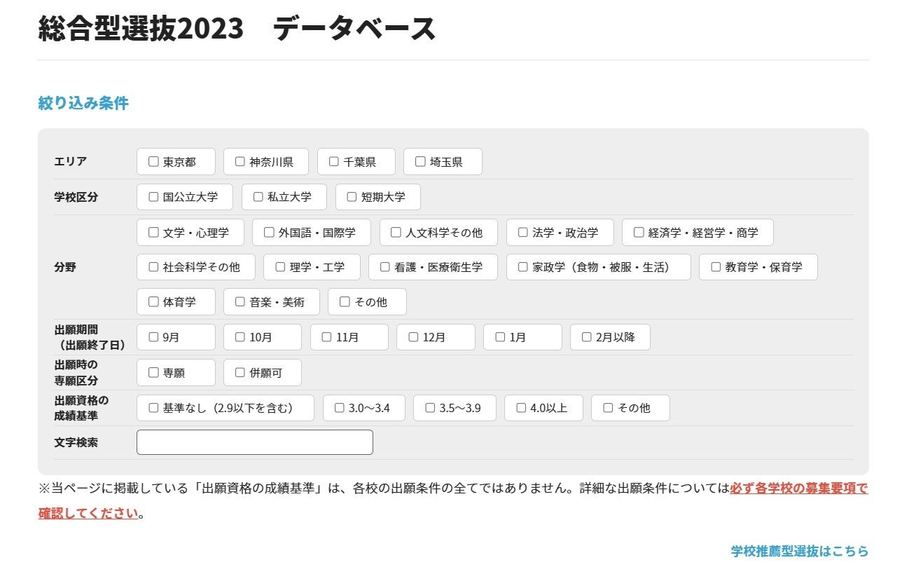 さらに「エリア」、「成績基準」、「分野(学問)」などの細かい絞り込みをかけることで、自分の希望条件に合う大学を見つけやすくなります。当WEBページが受験生の皆様のご参考となれば幸いです。
