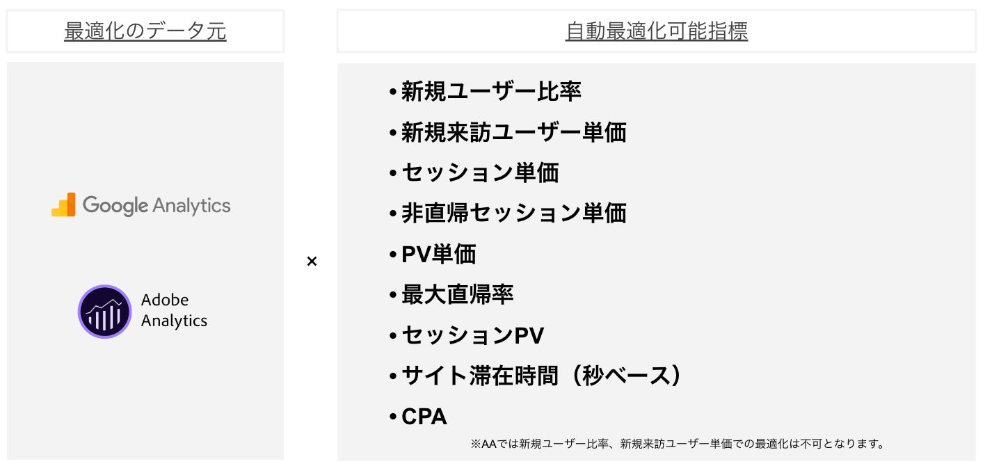 エンゲージメントとパフォーマンスの向上を目的に構築され、Googleアナリティクス / Adobe アナリティクスとの連携機能でクリック後の行動を最適化対象として配信を行うことが可能になります。