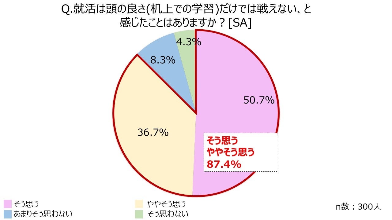 - 約9割の就活生が、就職活動は頭の良さ(机上での学習)だけでは戦えないと感じている