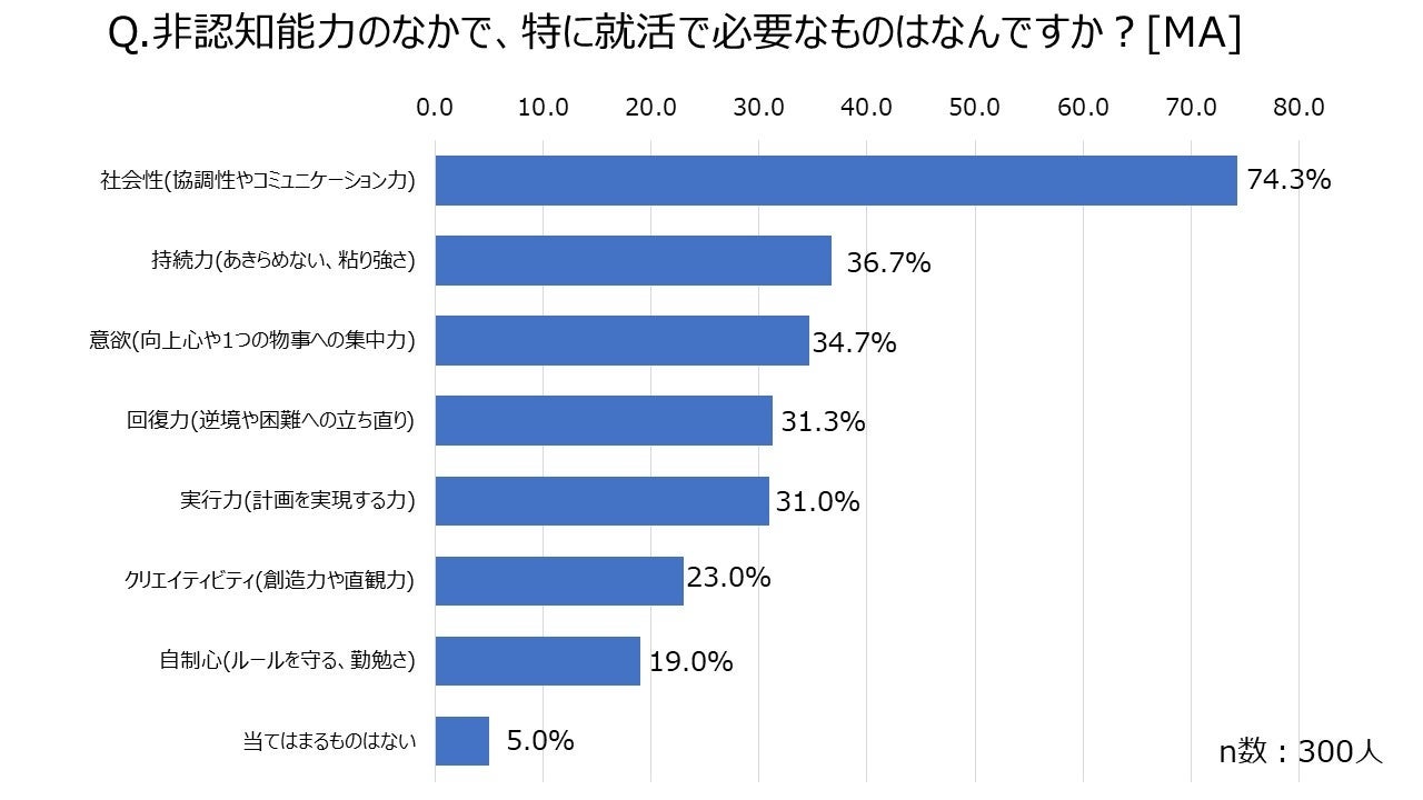 - 「非認知能力」のなかで就職活動において最も必要なものは「社会性(協調性やコミュニケーション力)」(74.3%)、就職活動中、特に社会性が求められる場面は個人面接であることが明らかに