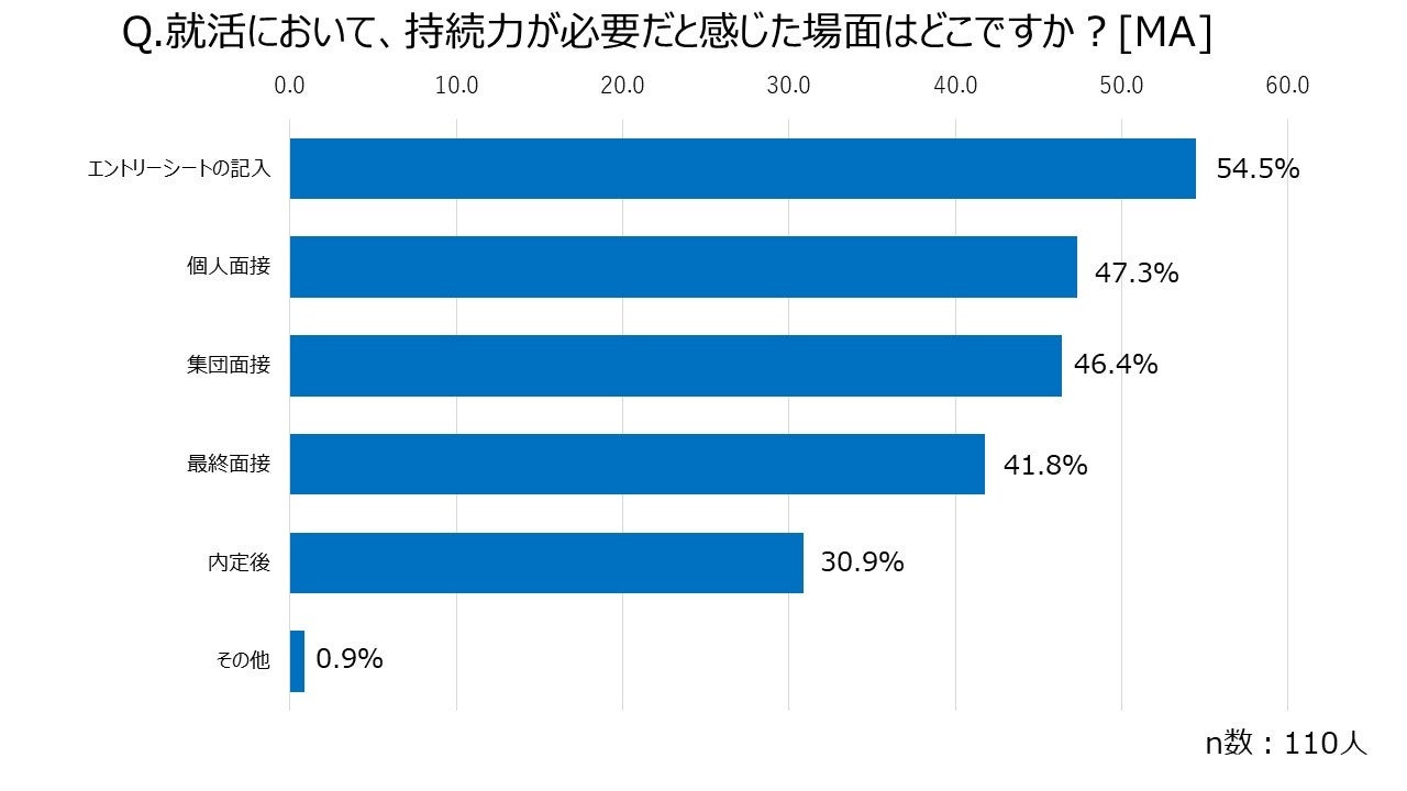 また、社会性に次いで、必要だと感じた力は「持続力(あきらめない、粘り強さ)」であると36.7%の就活生が回答。特に就職活動において持続力が求められる場所はエントリーシートの記入という結果になりました。