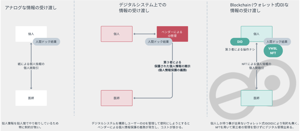 本提携では、VWBLを活用し医療情報事業者が採血者個人に採血結果をプラットフォームなどの第三者を介せずに送ることで、プラットフォームにおける個人情報管理コストの圧縮や情報漏洩リスク軽減を可能にするための実証実験を行います。