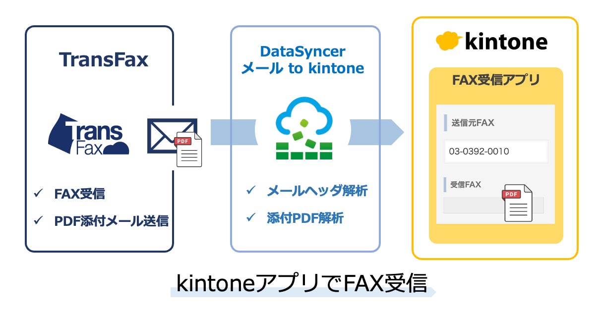 - TransFaxにて受信したFAXデータをメールのPDF添付としてクラウド上の「DataSyncer メール to kintone」に送信