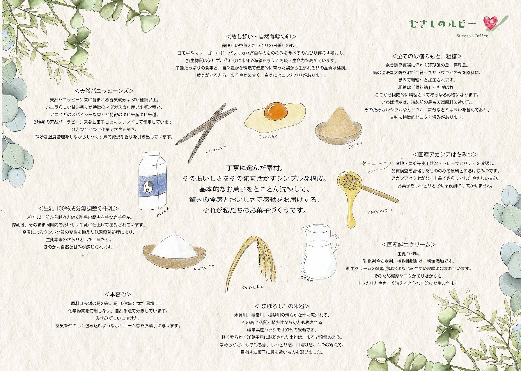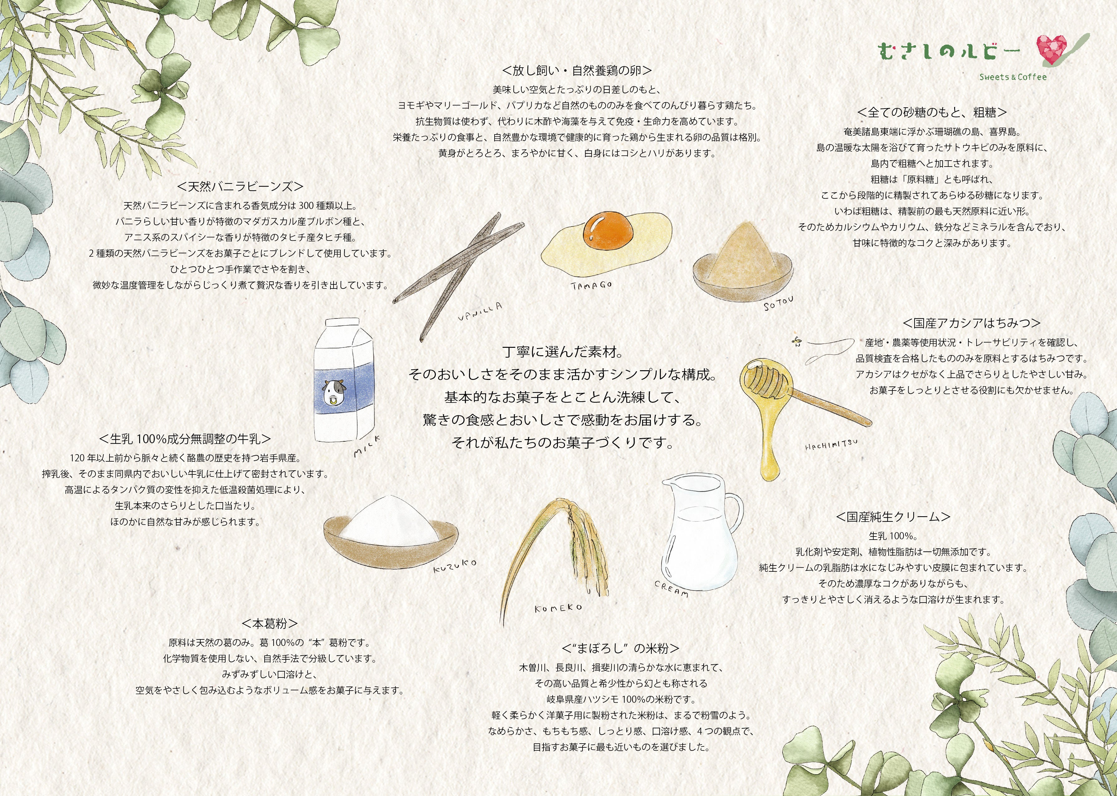 商品ごとにブレンドして使⽤するマダガスカル産・タヒチ産の天然バニラビーンズ、⾃然あふれる環境の下天然飼料のみで育成された鶏から⽣まれる卵、ミネラル豊富でコク深い⽢みの粗糖、国産うるち⽶を洋菓⼦⽤に微細に製粉した⽶粉、100%葛の根を原料とする本葛粉・・・など、素材を厳選し、そのおいしさをシンプルな構成でそのままに活かすお菓⼦が特徴です。