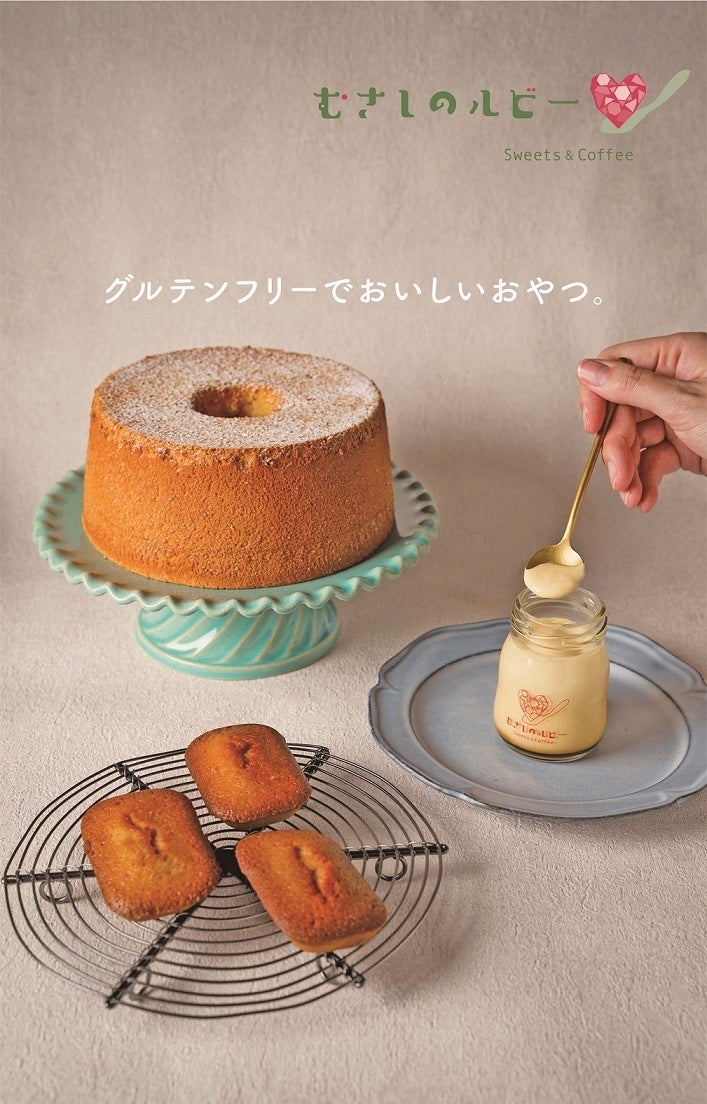 むさしのルビーの商品ラインナップはプリン(ボトルスイーツ)、シフォンケーキ、フィナンシェなど。⽶粉を使⽤しているため焼菓子は全品グルテンフリーで、保存料や着⾊料、ベーキングパウダーも使⽤しておりません。
