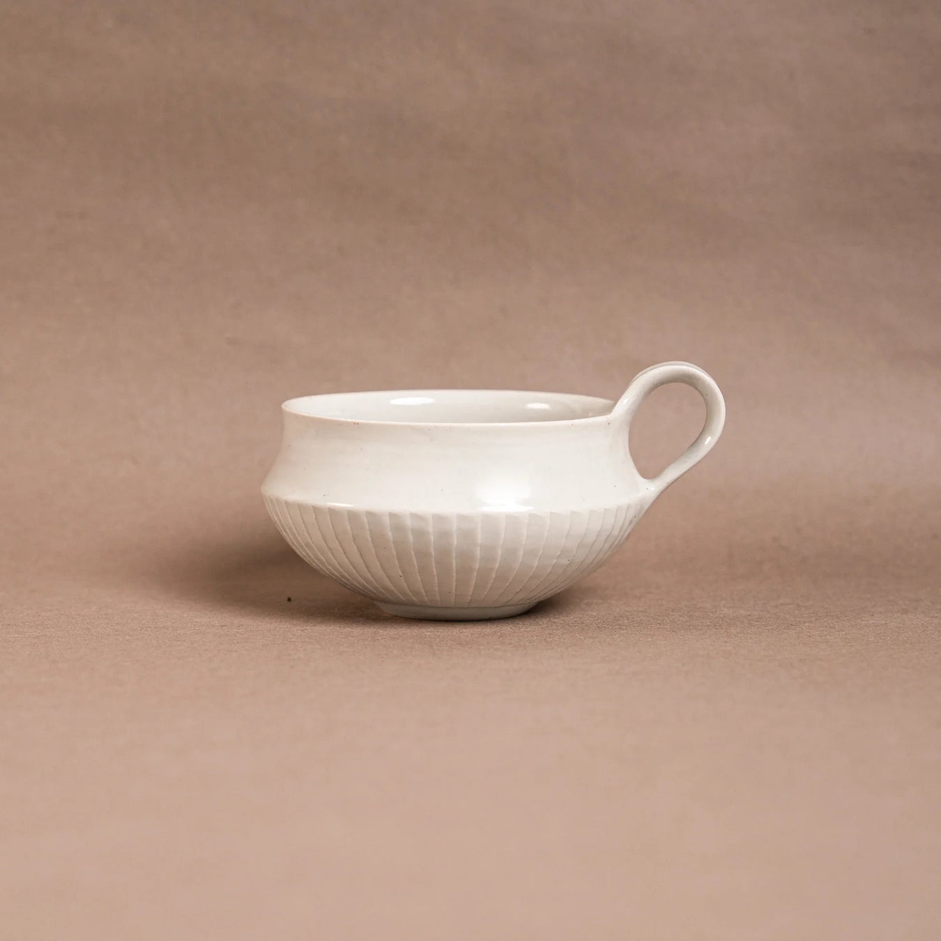下半分だけ鎬(しのぎ)が彫られた、白磁のスープマグです。 口縁の下が少しくぼんでいるのは、丹念に削りを入れ、口当たりを良くするためのこだわりです。 削りによって造形の美しさが増します。