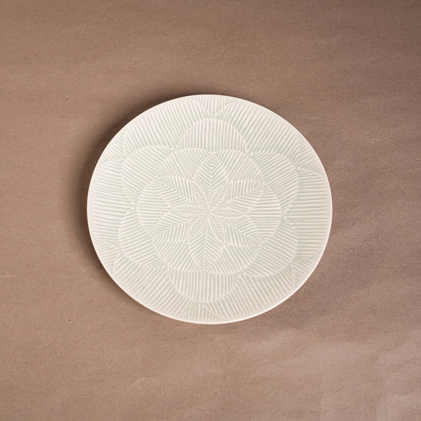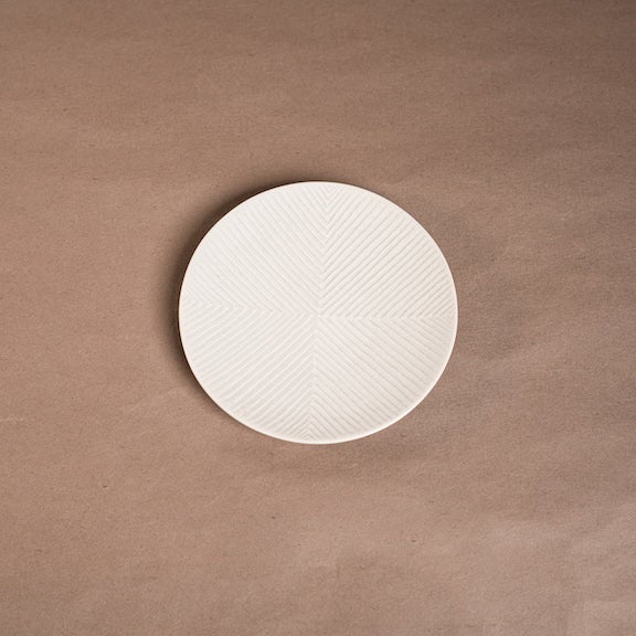 見込みを四分割して、違う方向から丹念に一本ずつ線を入れる鎬(しのぎ)の技法で作られている白磁のお皿です。 上品な艶感で食卓に馴染み、和洋問わず料理を引き立てます。