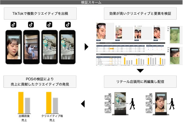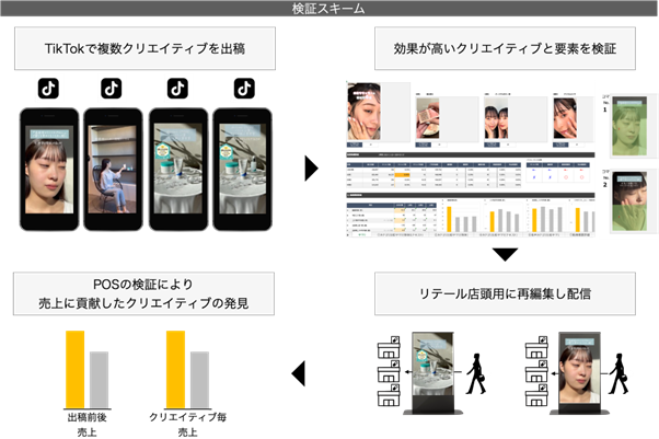 組み合わせたもので、TikTok上のクリエイティブで効果が良かったものを選抜し、それをさらにリテールメディアに出稿し、検証することで、より売上に貢献するクリエイティブの発見と共に、購買までのPDCAを実現するものです。