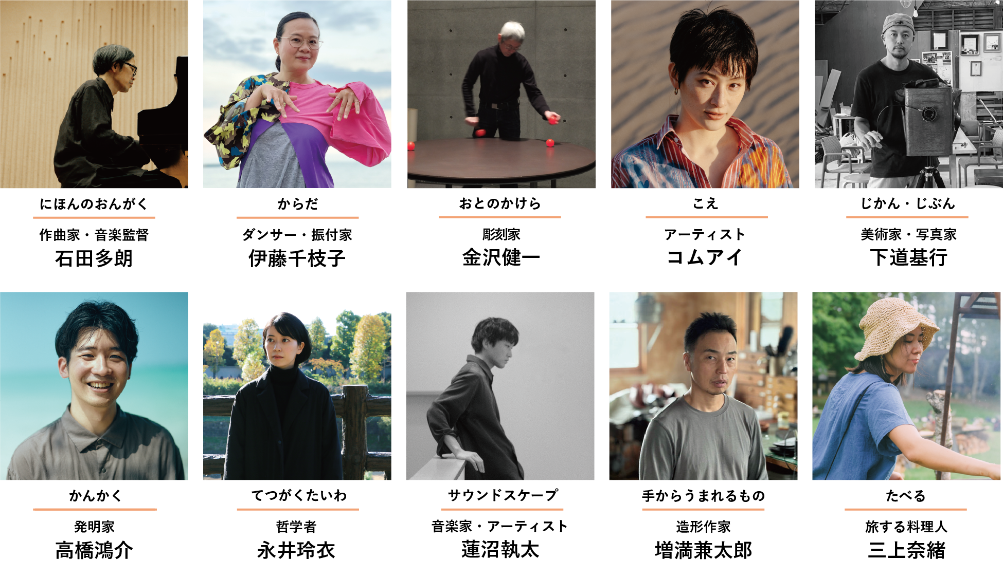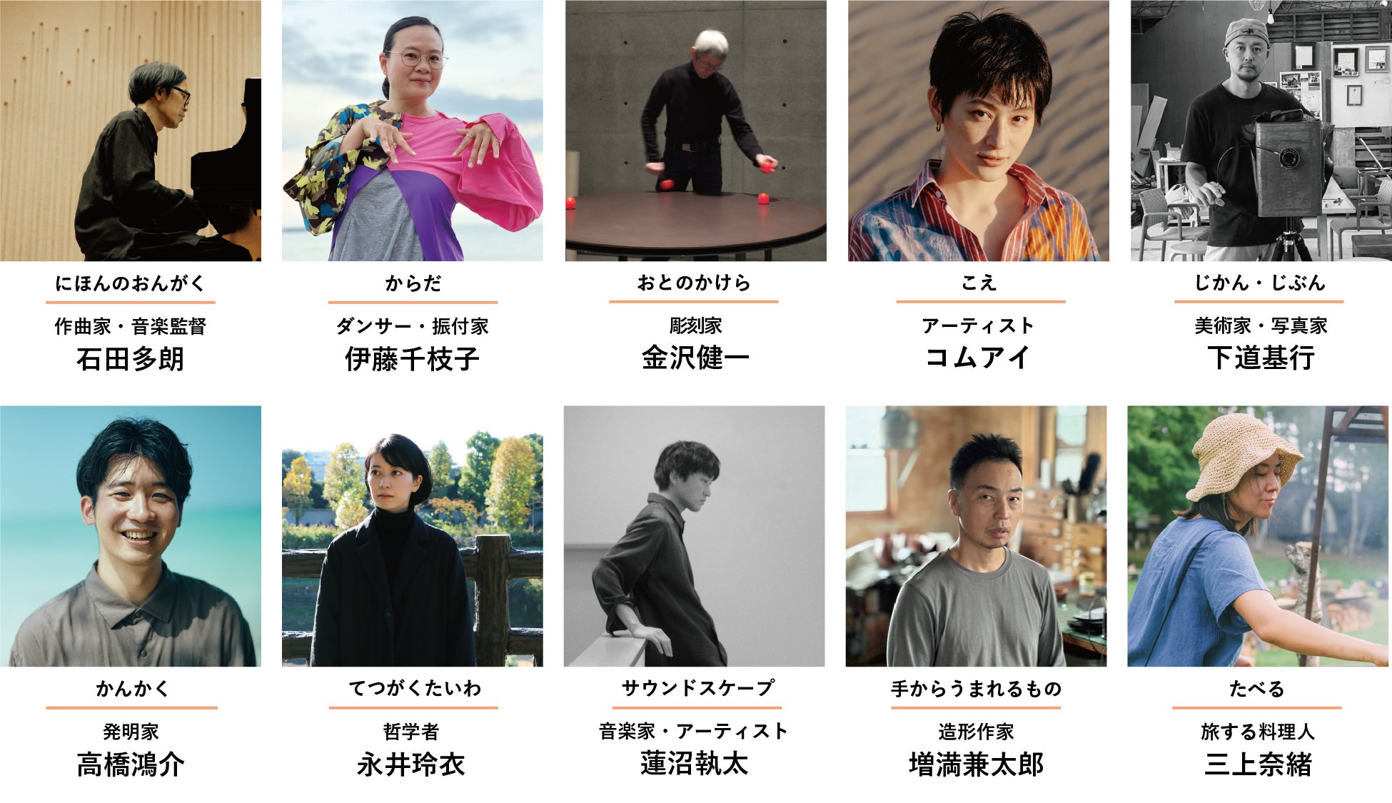 石田多朗/作曲家、伊藤千枝子/ダンサー、金沢健一/彫刻家、コムアイ/アーティスト、