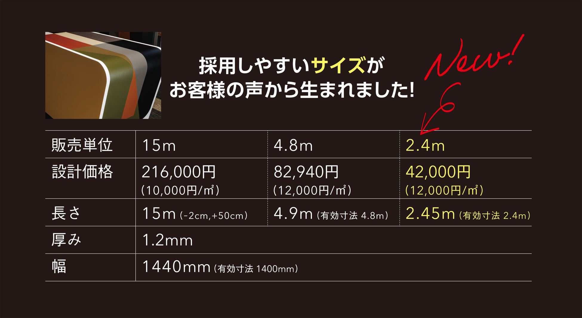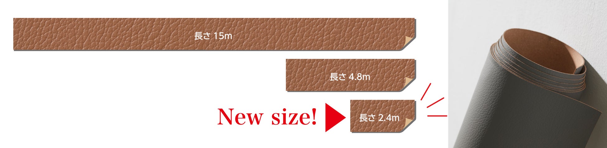 2023年6月に今までにない「サスティナブルな新素材」として発売以来、ホテルや百貨店、住宅など、様々な場所で採用され、その上質な素材感とサスティナビリティへの貢献から高い評価を得ています。しかし、これまで展開していた15mと4.8mの2サイズでは、テーブルなどの天板製作時に余りが出てしまうという課題がありました。