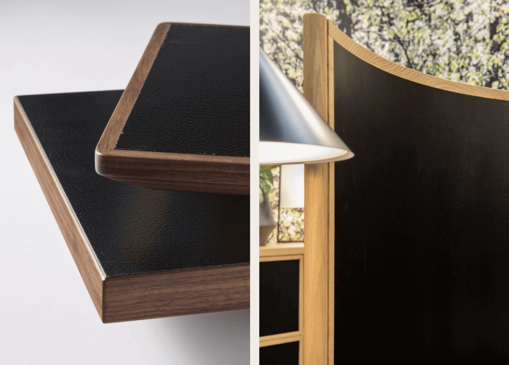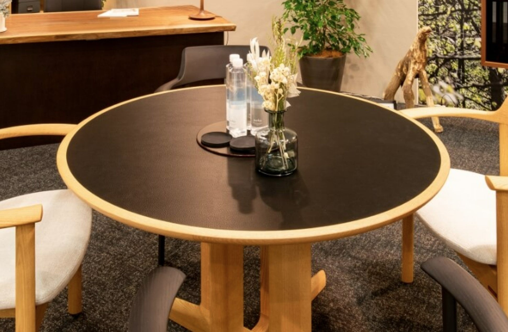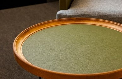 「アップボーンレザー ファイバシート」は、革製品の端材をアップサイクルした、環境負荷の低いサスティナブルな内装用化粧材です。革製品のようなさわり心地や香りが特徴で、メラミン化粧板のように机の天板などにも使用でき、上質感あふれる空間を演出します。