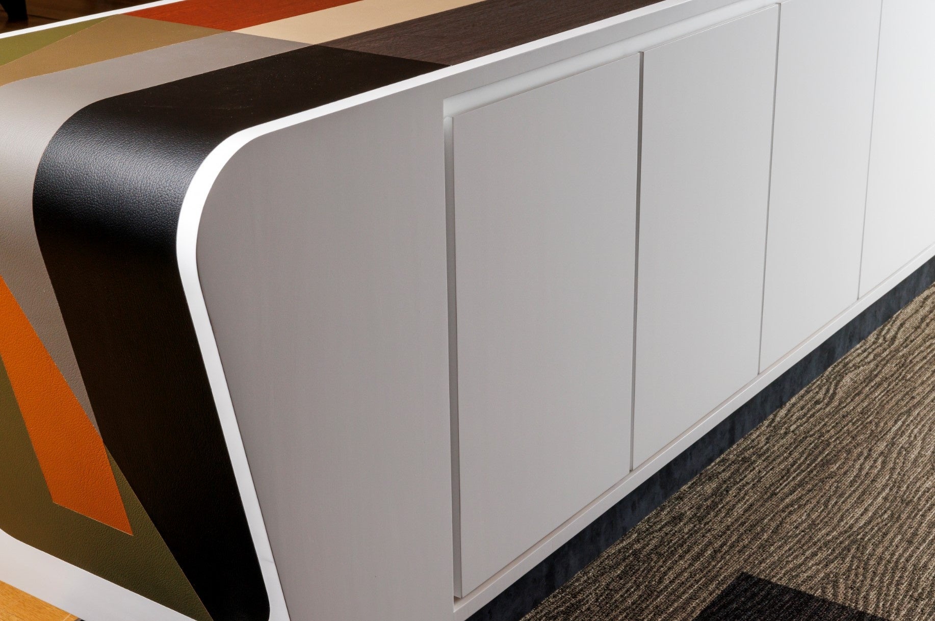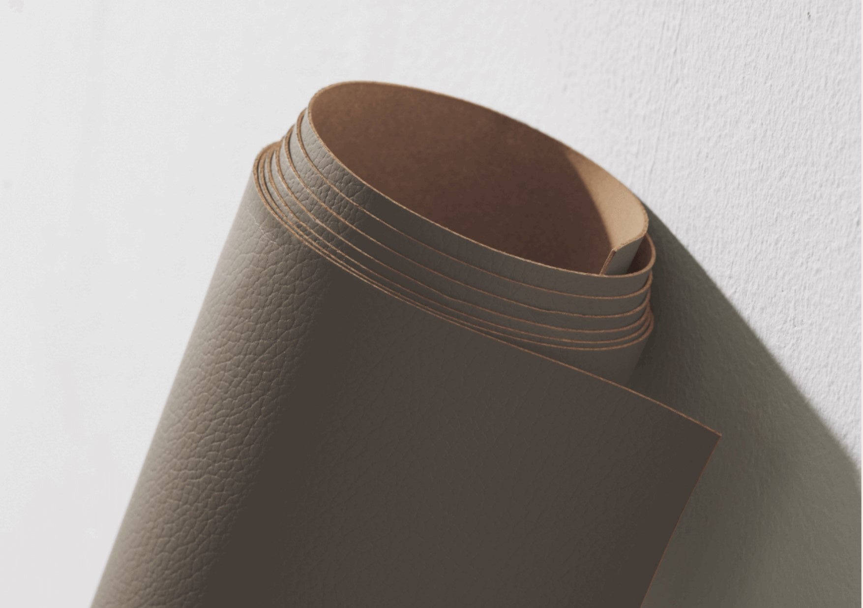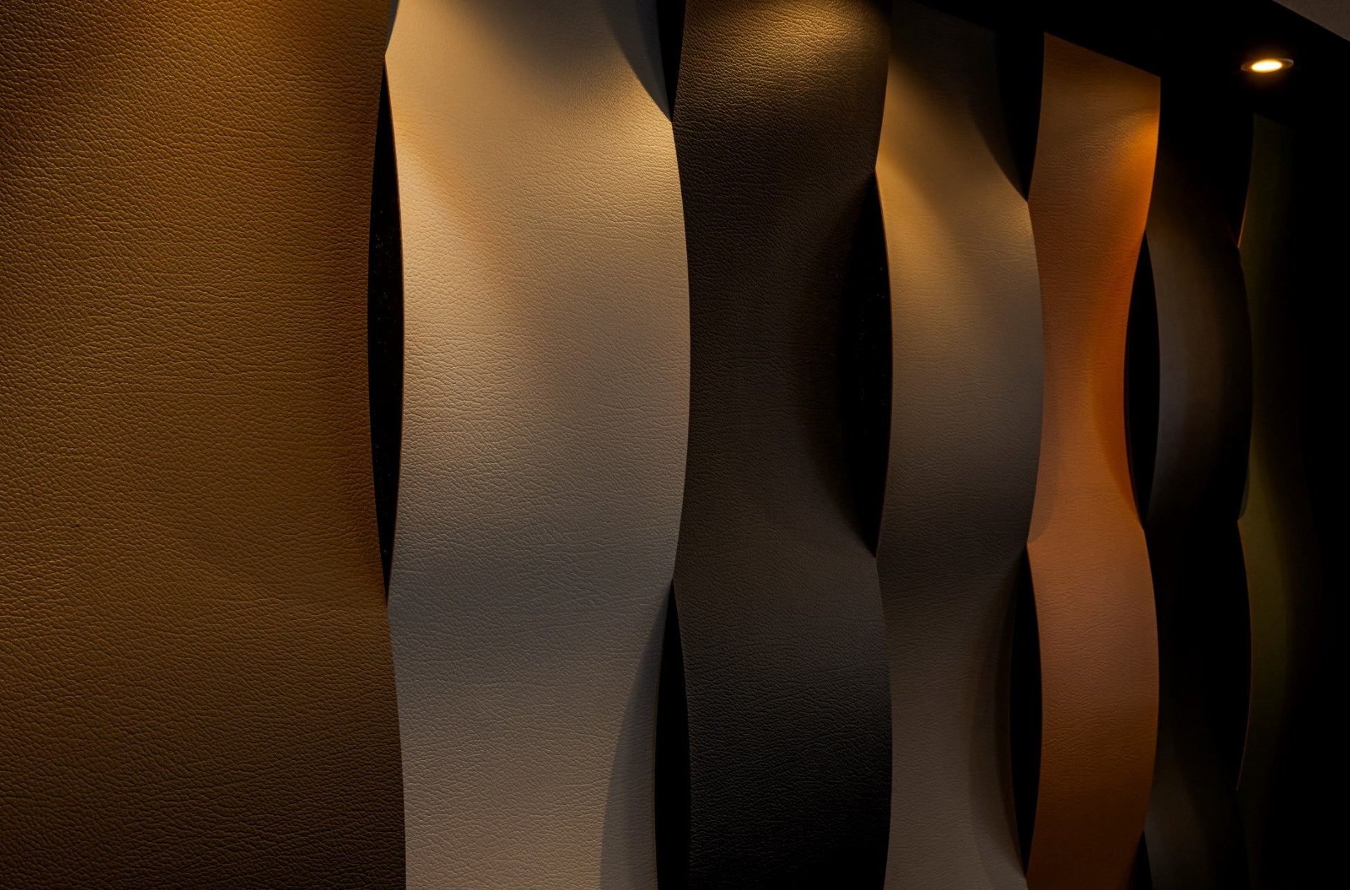 「アップボーンレザー ファイバシート」は、最大15mの継ぎ目のない素材としてご提供が可能です。リアルレザーでは難しかった、シームレスに覆う、大きな什器デザインを実現できます。