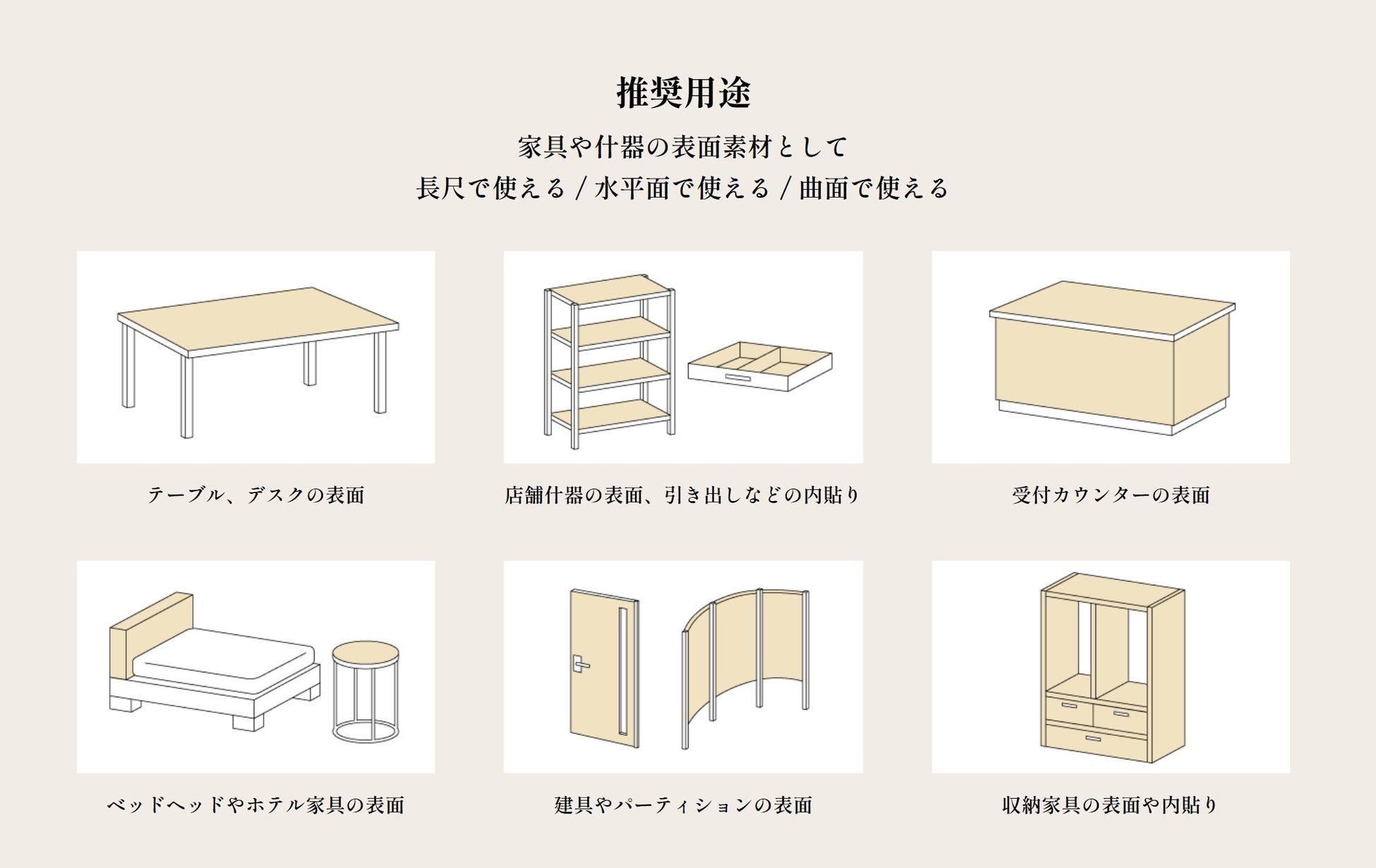ベニヤ、合板、MDFなどの基材に貼りやすく、様々な家具のデザインに豊かな表情を与えます。曲面や複雑な形状にも対応できるため、デザイナーの創造性を最大限に引き出す素材として活躍します。