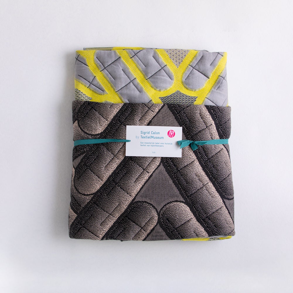 ティルブルフにあるテキスタイルミュージアムにて収蔵・販売されているブランケット作品。片面ずつ異なるデザインが施せる最新の編み機の導入をフル活用したいと考え作らました。本展では、ブランケットのみならずテキスタイルミュージアムのご協力の元、シグリッド・カロンがデザインを手がけたキッチンタオルの販売も行います。