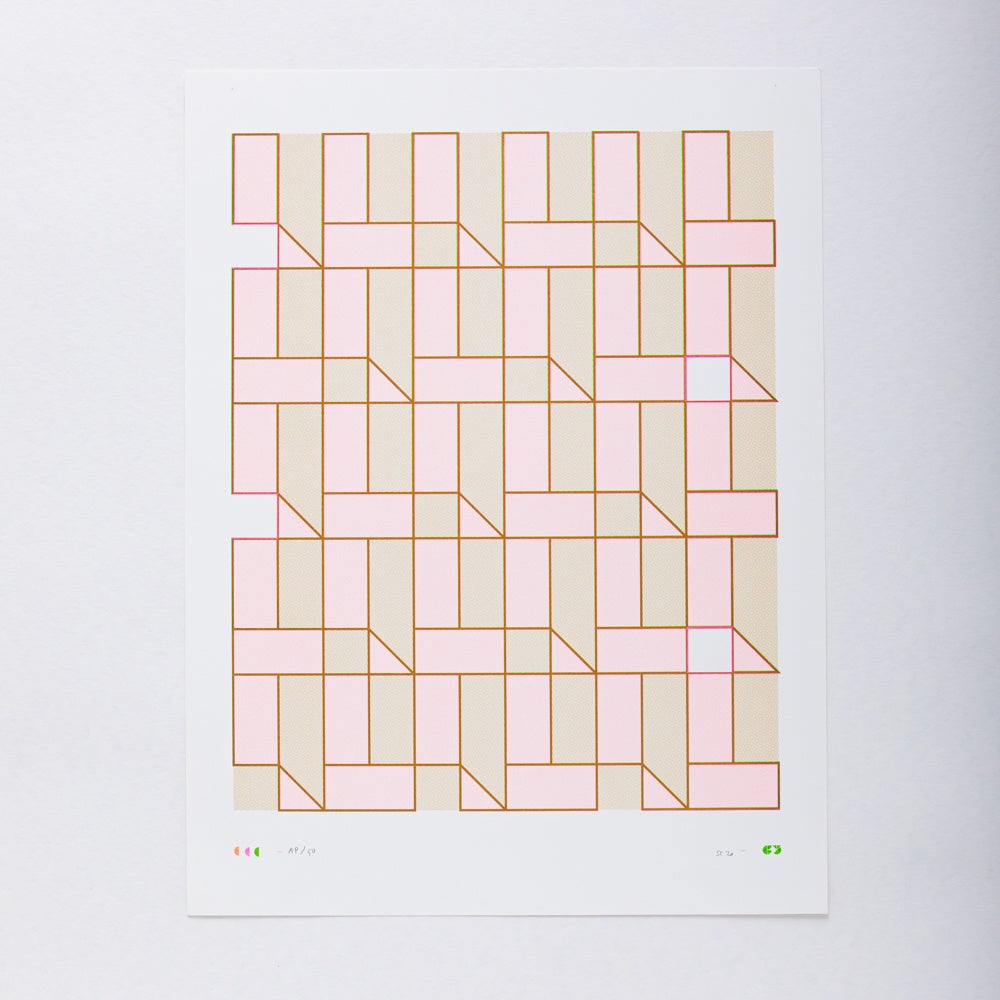 リソグラフ印刷を用いたプリント作品。新しい形や色の組み合わせを発見したいという好奇心から生まれ、無限の可能性を秘めた正方形、円、グリッドへのオマージュである。本展では25種類の中からお好きな作品を選択可能です。