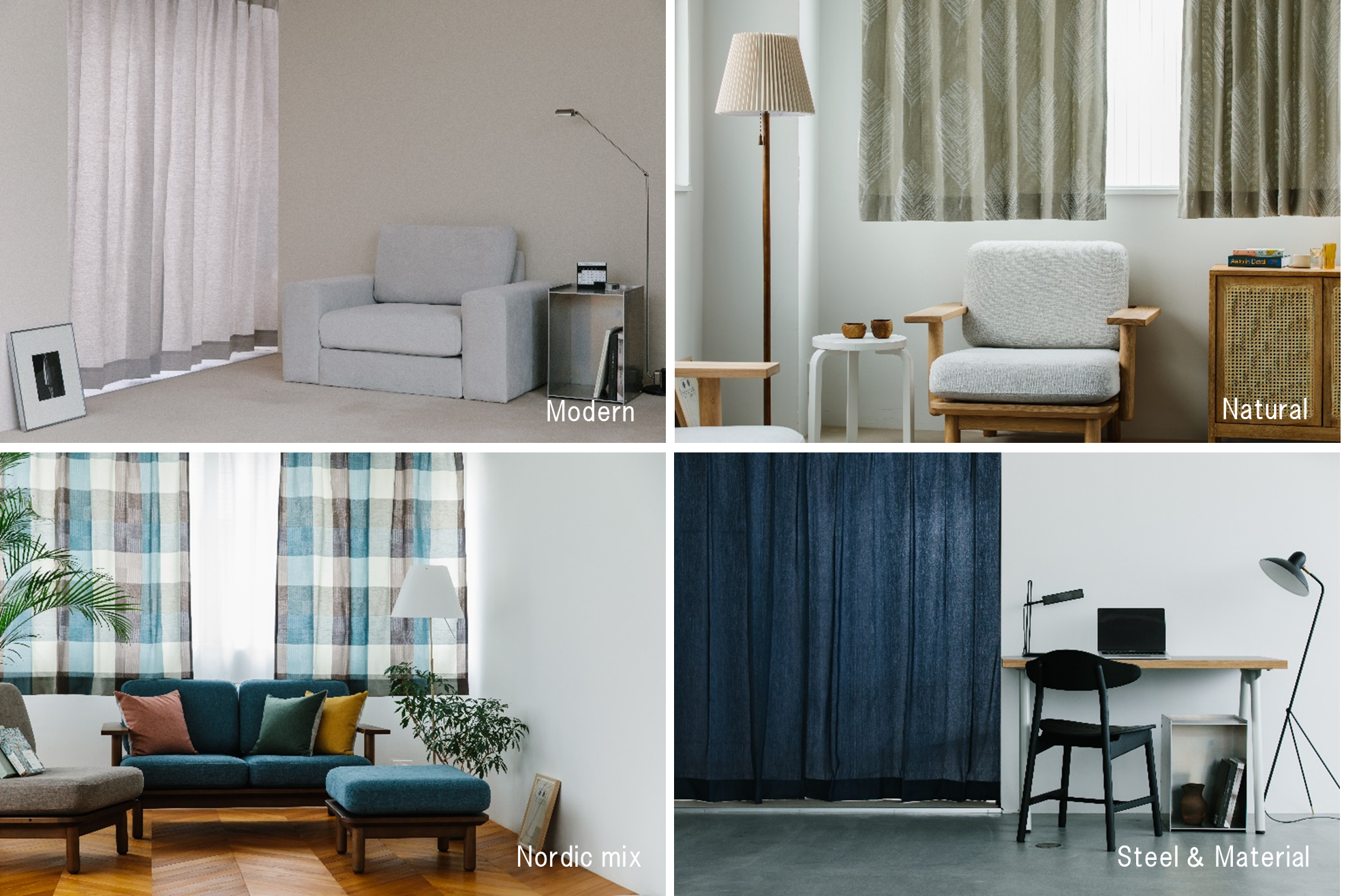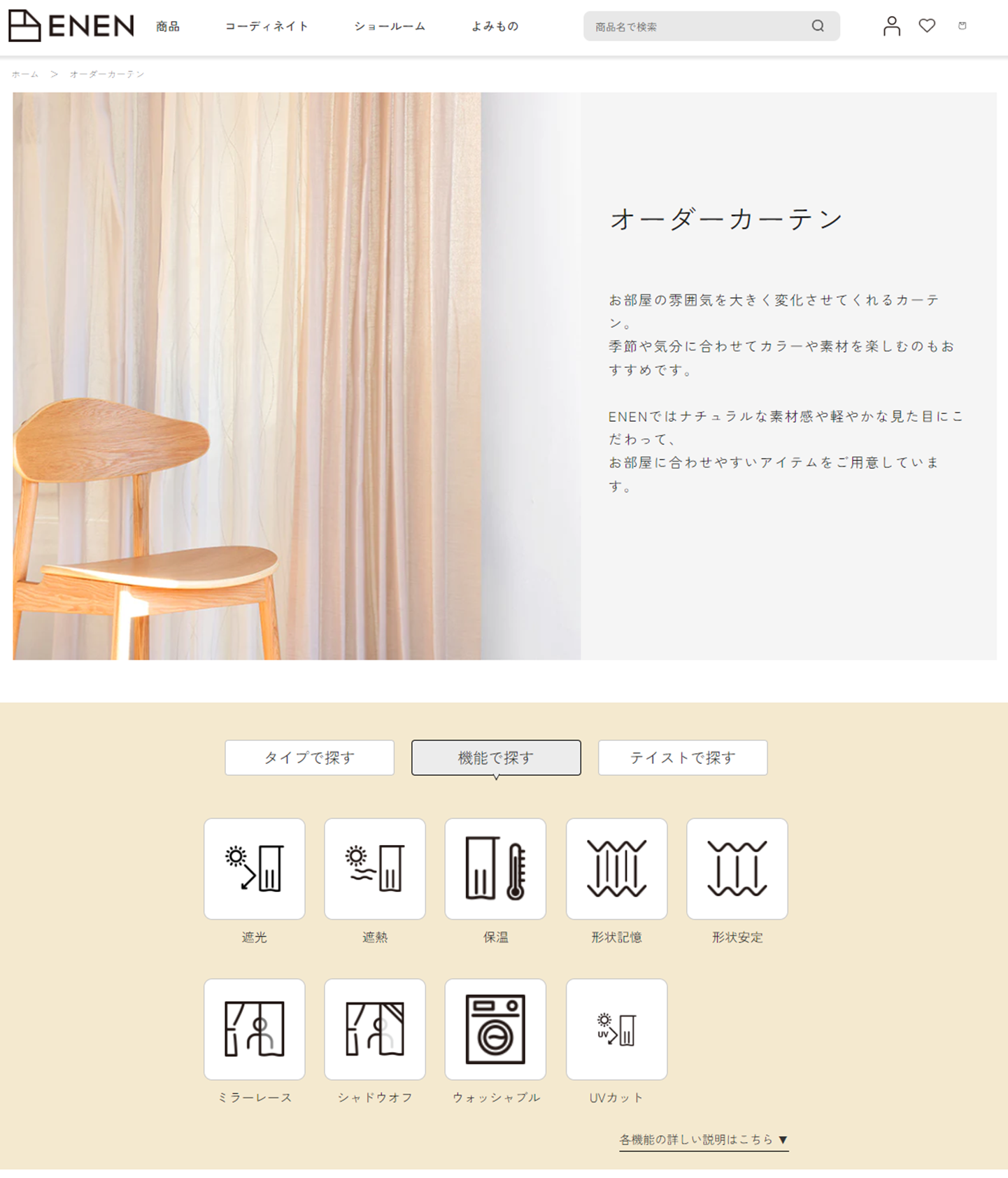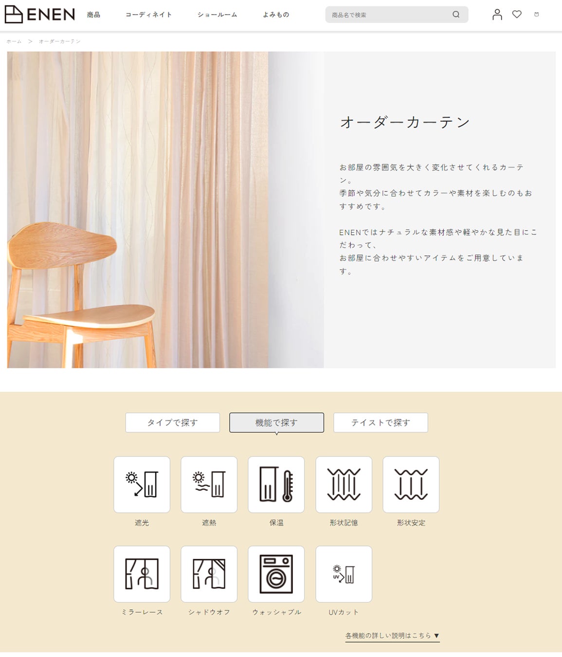 ENENの4つのテイスト「Natural・Nordic Mix・Steel & Material・Modern」と合わせやすいデザインや素材でセレクトした計53種類を販売します。1cm単位のサイズオーダーはもちろんのこと、開き方・スタイル・フックのオプションを選択して、自宅にぴったりなカーテンにカスタイマイズすることができます。「遮光、遮熱、保温、形状記憶、形態安定、ミラー、シャドウオフ、ウォッシャブル、UVカット」の機能付き商品を取り揃えています(付帯機能は商品によって異なります)。また、ファブリックサンプル提供(無料)は、7月中の開始予定です。