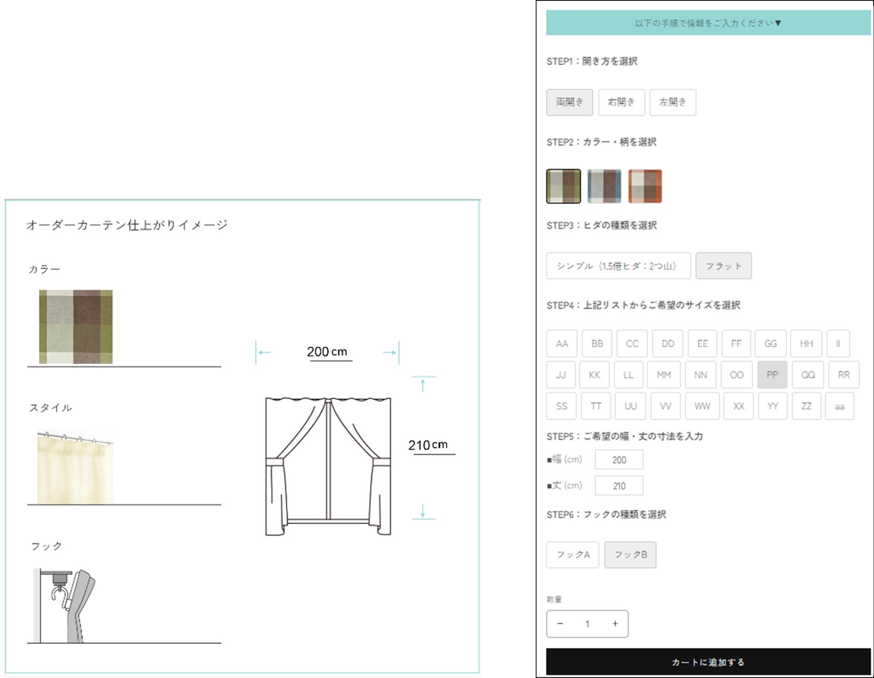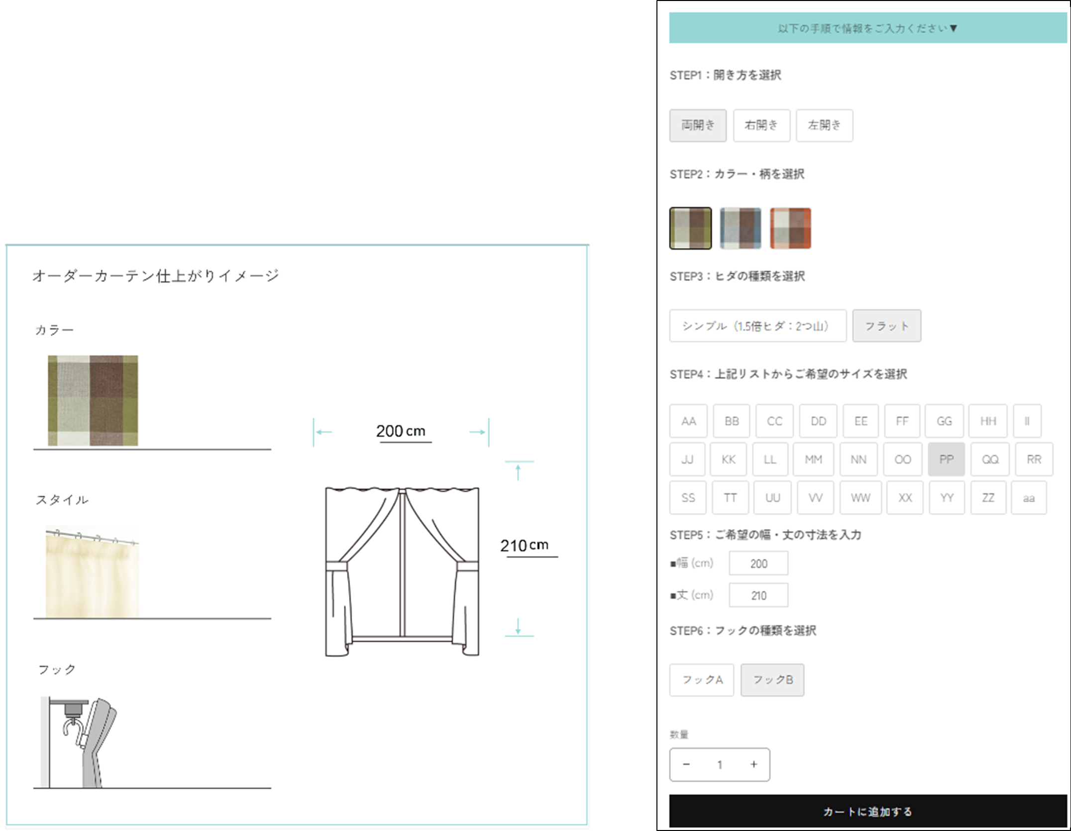 ② 1cm単位のサイズオーダーに加え、開き方、フック、スタイルのオプション選択が無料。