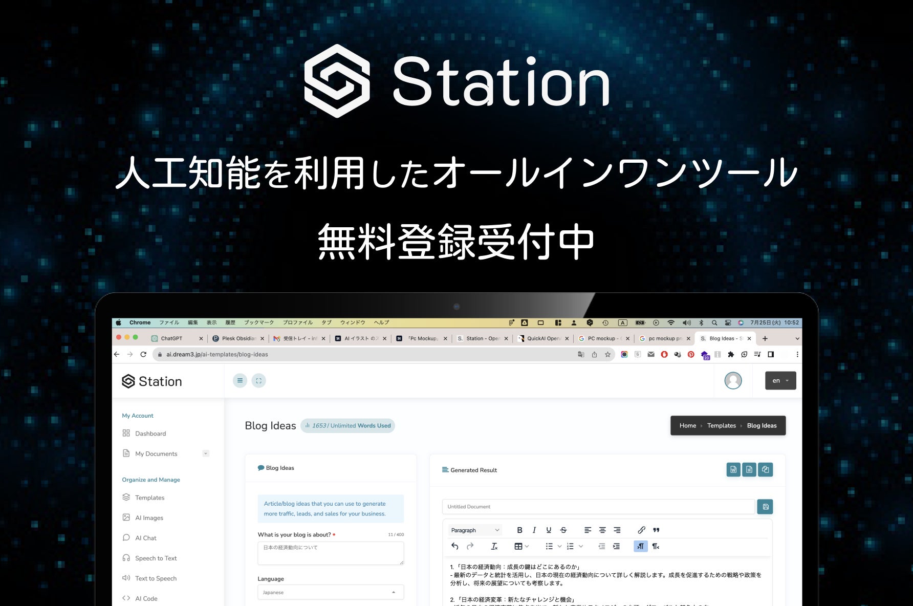 統合型AIの"Station"は、既にご存知のAI技術をさらに手軽に、さらに効果的に利用するための最適なツールです。あなたのビジネスにおける創造性と効率性を加速するため、ぜひStationをお試しください。