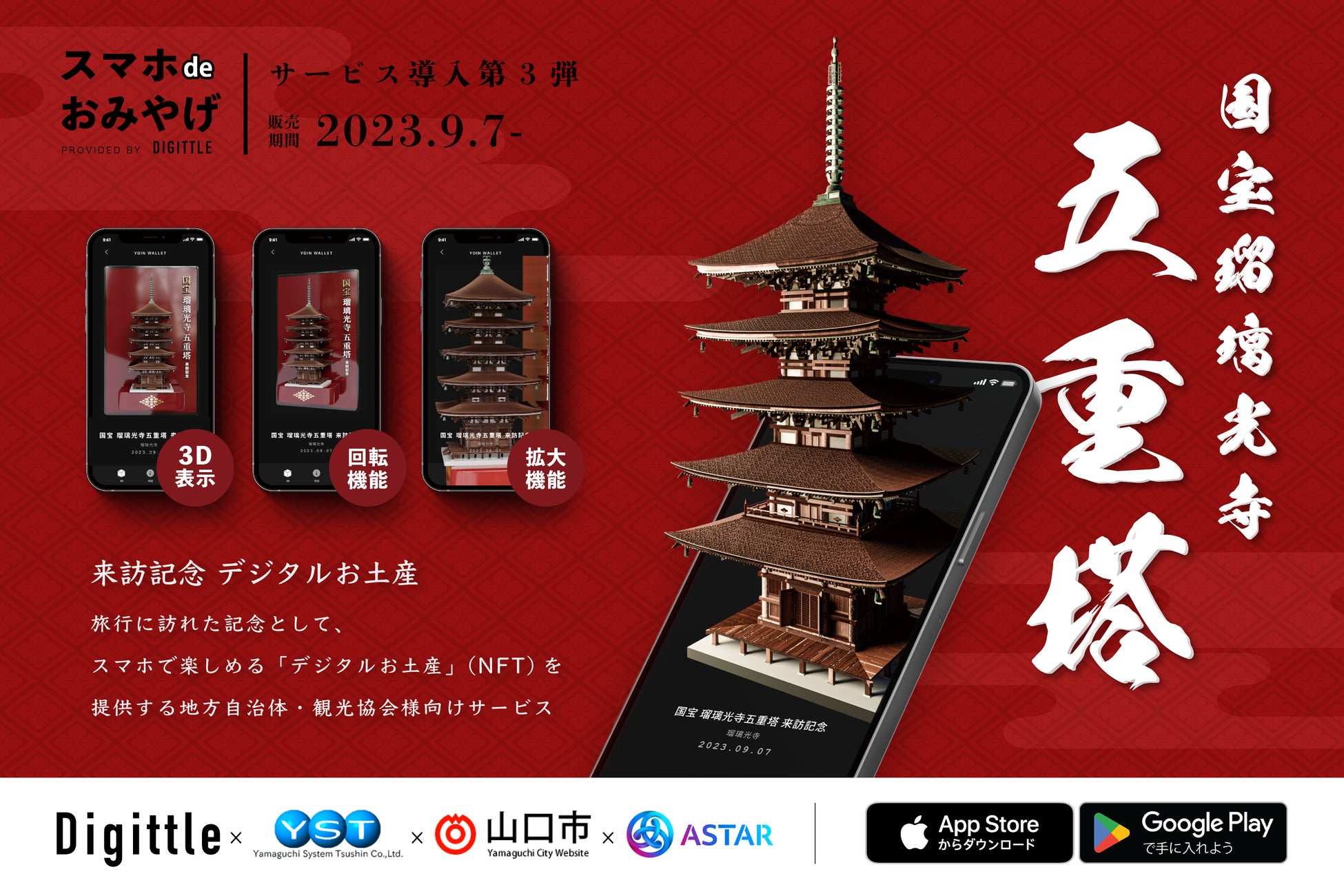 株式会社Digittle(本社:東京都渋谷区、代表取締役:韮澤 真人、以下当社)は、2023年9月7日(木)より、山口システム通信株式会社(本社:山口県山口市、代表取締役:田村 芳行)が主催する、山口県山口市・香山公園に所在する「国宝瑠璃光寺五重塔」のNFT販売に企画協力と技術提供を行います。本プロジェクトでは、当社の提供する、デジタル上でお土産を配布/販売する観光DXサービス「スマホ de おみやげ」(特許出願中※)を活用しております。※「スマホ de おみやげ」を含む、デジタル上のプレミアムコンテンツ配布に関する当社独自技術は特許出願中です。