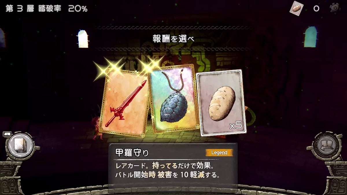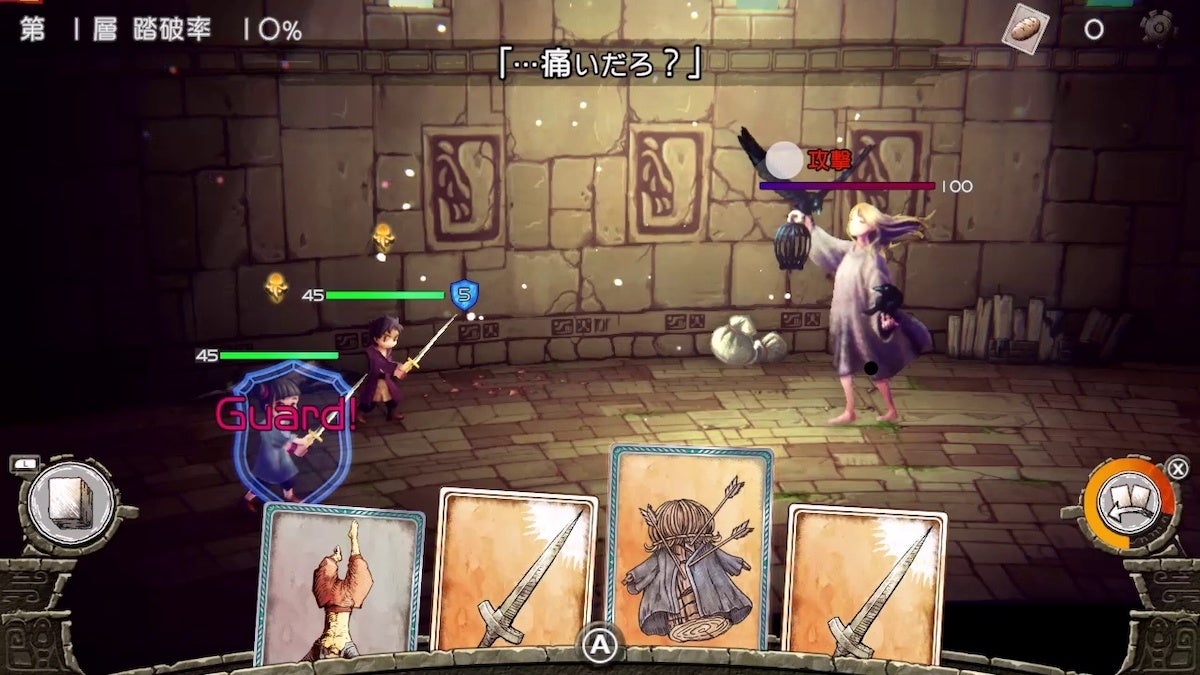 バトルはリアルタイムに進行する!敵の攻撃を盾でタイミングよくガードしたり、魔法を重ねて使って威力を強化したりと、刻々と変化する状況に合わせ、適切な手札を切って戦闘を有利に進めよう!また、カードには上下があり、向きによって効果の変わるものもある。意外な使い道が見つかることもあるので、色々と試してみるのも楽しみの一つだ。