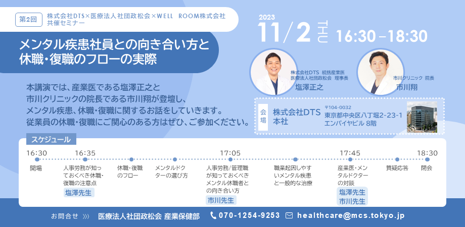 【11月2日(木) 株式会社DTS×医療法人社団政松会×WELL ROOM株式会社 共催】無料対面イベント「メンタル疾患社員との向き合い方と休職・復職のフローの実際」を開催