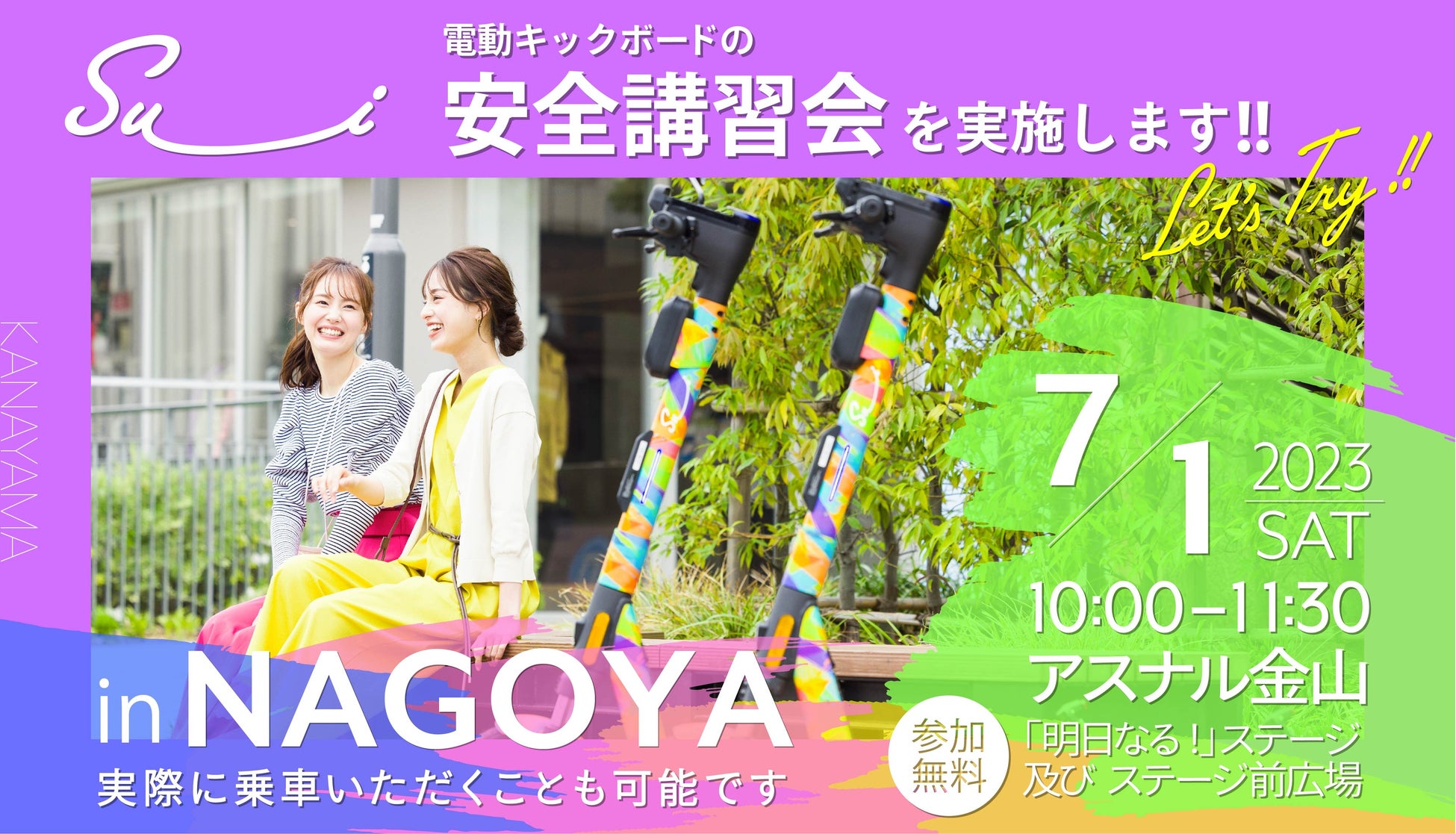 2023年4月末より名古屋市内で提供を開始している(※1)Su__iから、皆様に正しい交通ルールの理解や安全な運転技術の習得をいただくため、愛知県警・中警察署交通課の協力のもと、電動キックボードの交通ルール啓発と乗車体験イベントを開催することとなりました。皆様に適切なサービスのご利用をしていただけるよう、安全講習会やキャンペーン活動を継続的に実施してまいります。