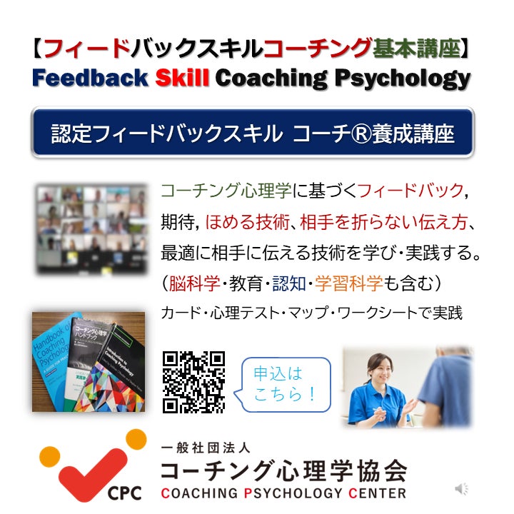 ◆【講習内容】:コーチング心理学,ポジティブ心理学,教育心理学などに基づき適切に【ほめる技術と伝え方の技術】を学びます。【フィードバックの心理学】及び「フィードバック技術」を基本と応用を体系的に習得します。「フィードバックスキル」は,レジリエンス、教育の効果,自己肯定感,ポジティブ感情や人間関係の向上などに役立つことが分かっています。(コーチング心理士®、コンサルティング心理士®、コミュニケーション心理士®などの共通必修科目です。)