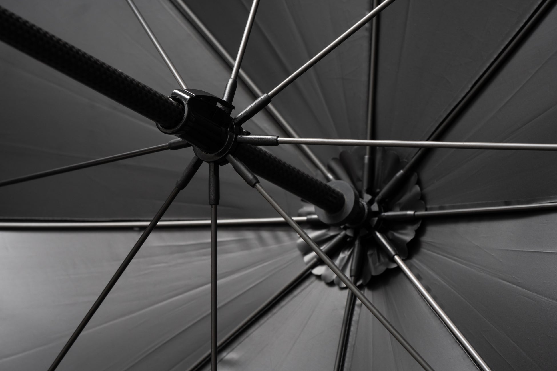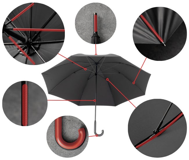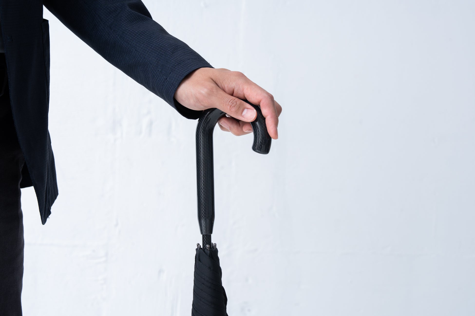 カーボン素材は航空機やロケット、レーシングカーなどに使用される軽くて丈夫な最先端素材です。この傘は、突から持ち手まで、主要な構造にカーボン素材を使用しています。金属ではないので錆びにくく、丈夫な素材ならではのしなやかさを併せ持つ、軽くて壊れにくい傘です。