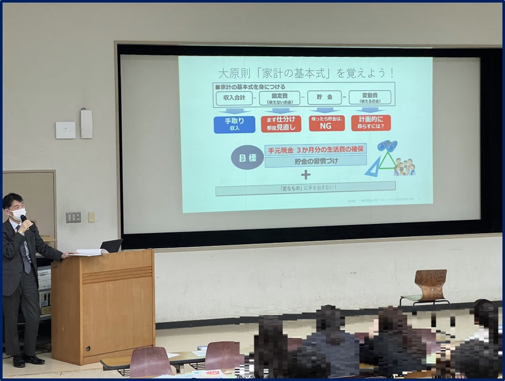 ●前半は、当法人がこれまで相談者と接した中から得た知見と、この4月から一人暮らしを始めた学生も多いことから家計の基本式などを紹介しました。