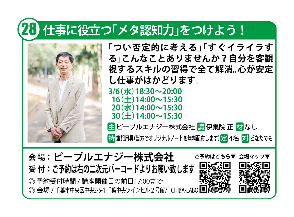 ⼈材コンサルティングのピープルエナジー株式会社(本社:千葉県四街道市、代表取締役:伊集院正)は、チバラボ会員のプロフェッショナル宮田、木村、市原の3名と共に2024年千葉まちゼミに出展します。チバラボは千葉市における起業家支援の施設です。